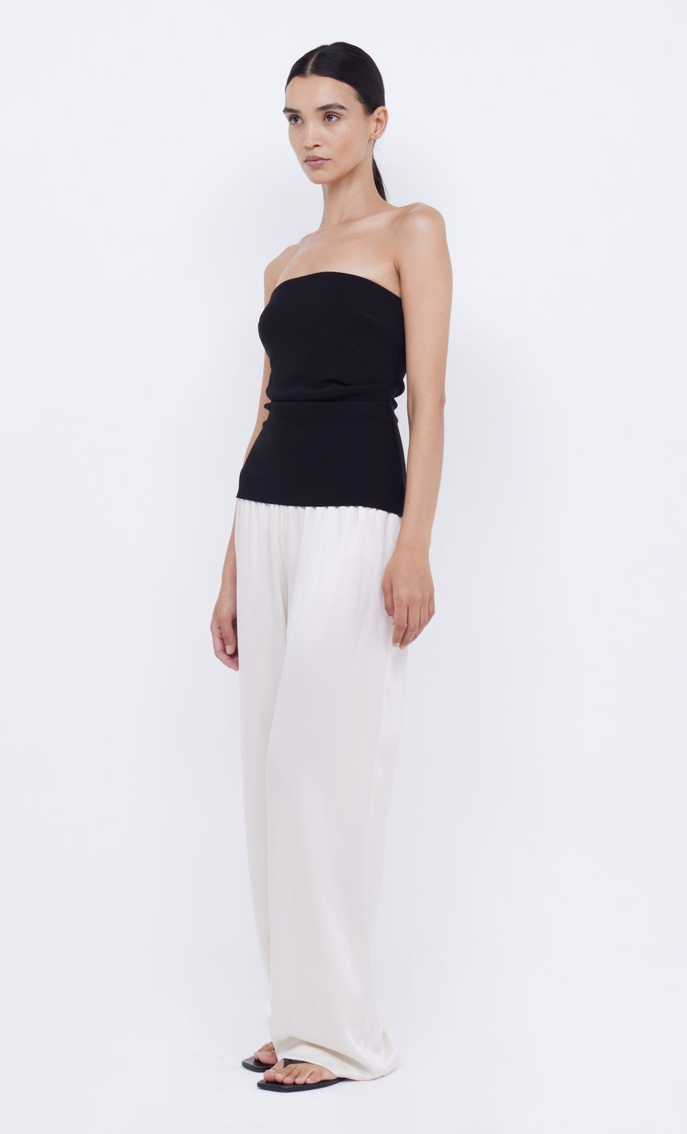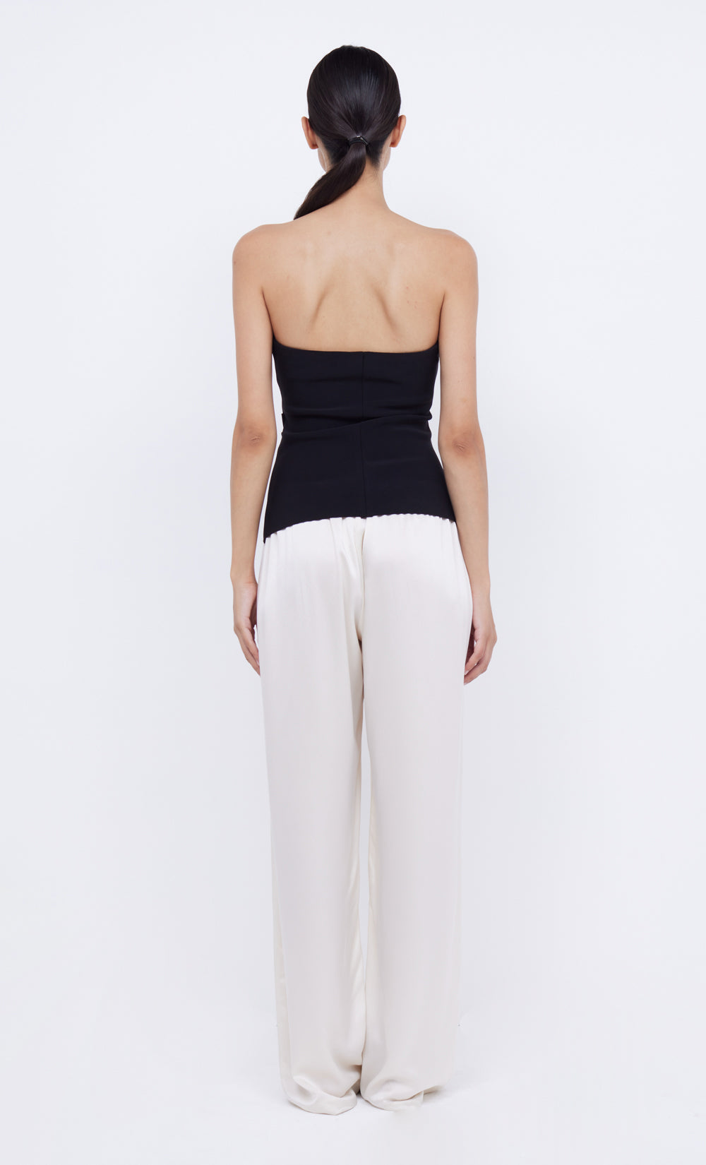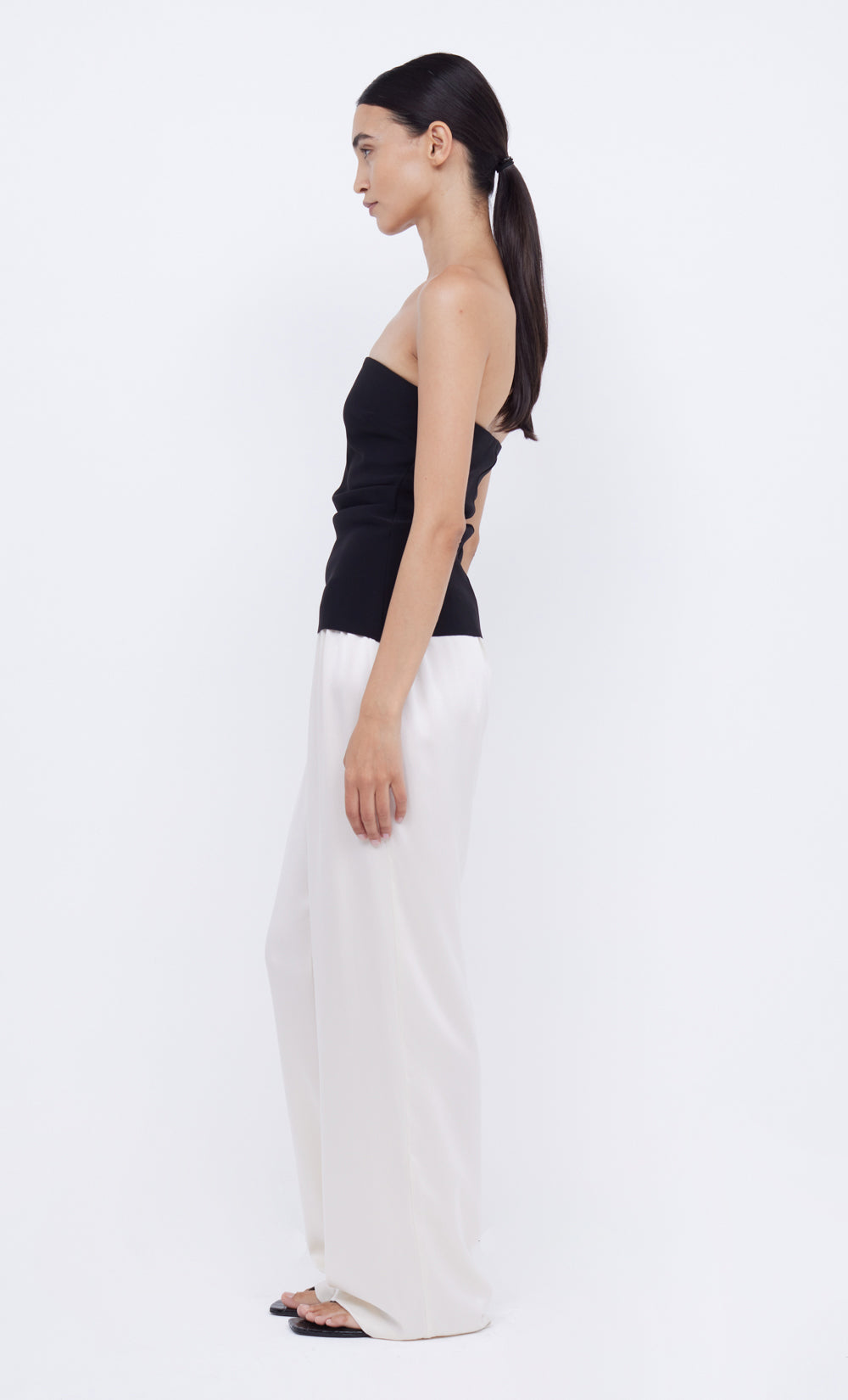The Chic Adele Bodice is cut from our bonded stretch crepe fabric that cinches in the body and skims the silhouette. The strapless top features a slightly curved neckline and tuck detailing. Styled with our Cari Pant.