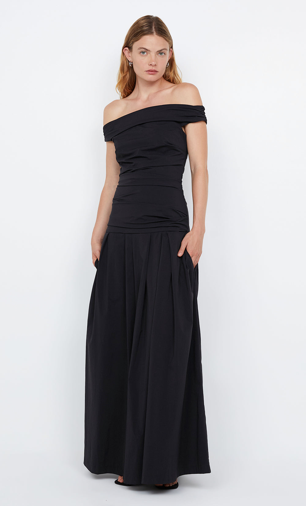 The BEC + BRIDGE Apolline Maxi Dress in Black features a flattering drop waist and off-the-shoulder design that drapes beautifully over the body. Made from stretch nylon, it includes in-seam pockets and an invisible side zipper for an effortless finish.
