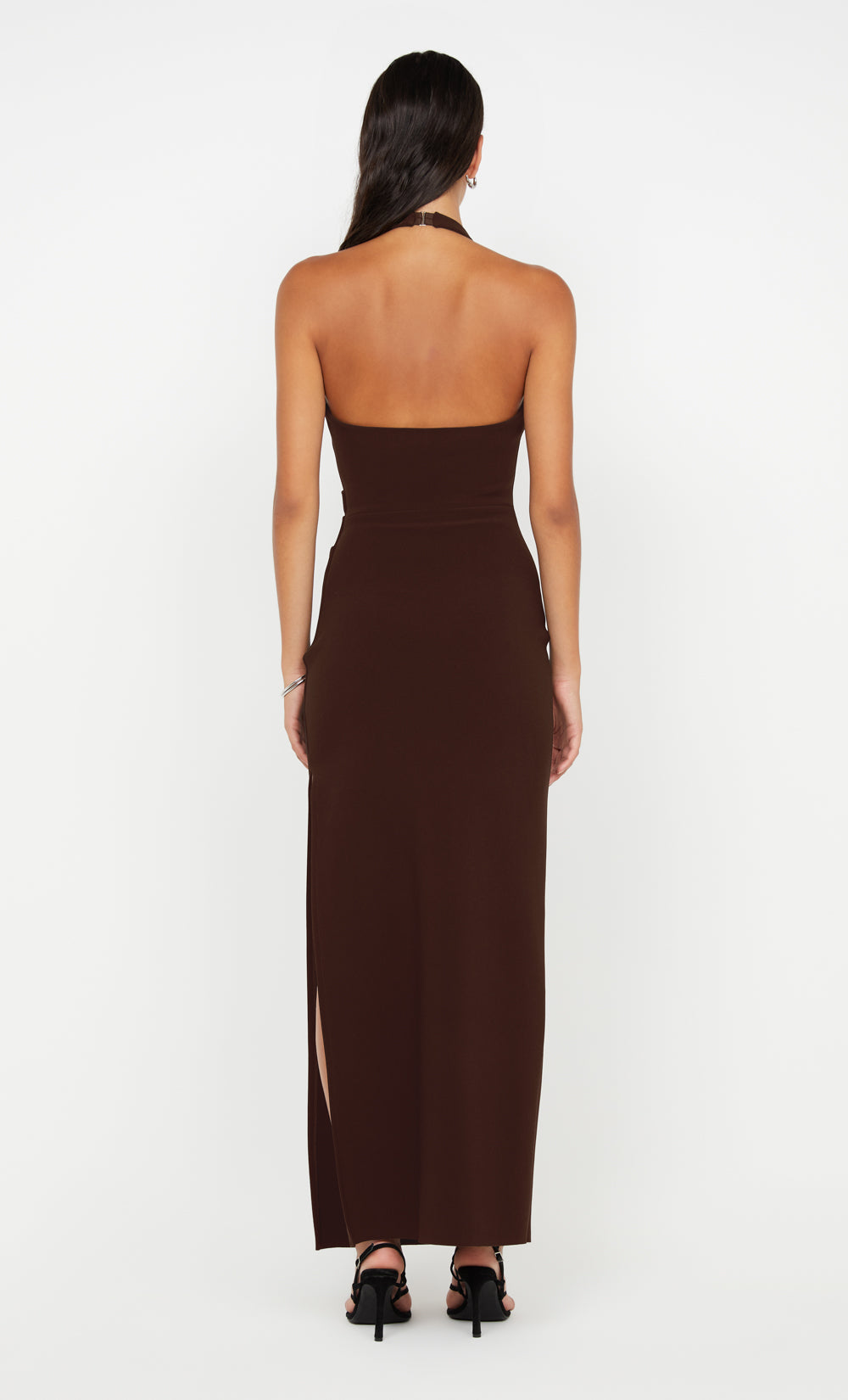 The BEC + BRIDGE Asta Maxi Dress in Dark Chocolate is a sleek, figure-hugging design with a high halter neckline. It features tucks at the waistline, a thigh-high split at the side seam, and an open back for a modern, bold look. Made from our signature Bonded Crepe fabric, the dress offers a stretch fit that sculpts the body. It is accessed via an e-hook at the back neckline and is finished with a raw hemline for a contemporary edge. Perfect for formal events, evening dinners, or upscale parties where you want to make a bold impression.