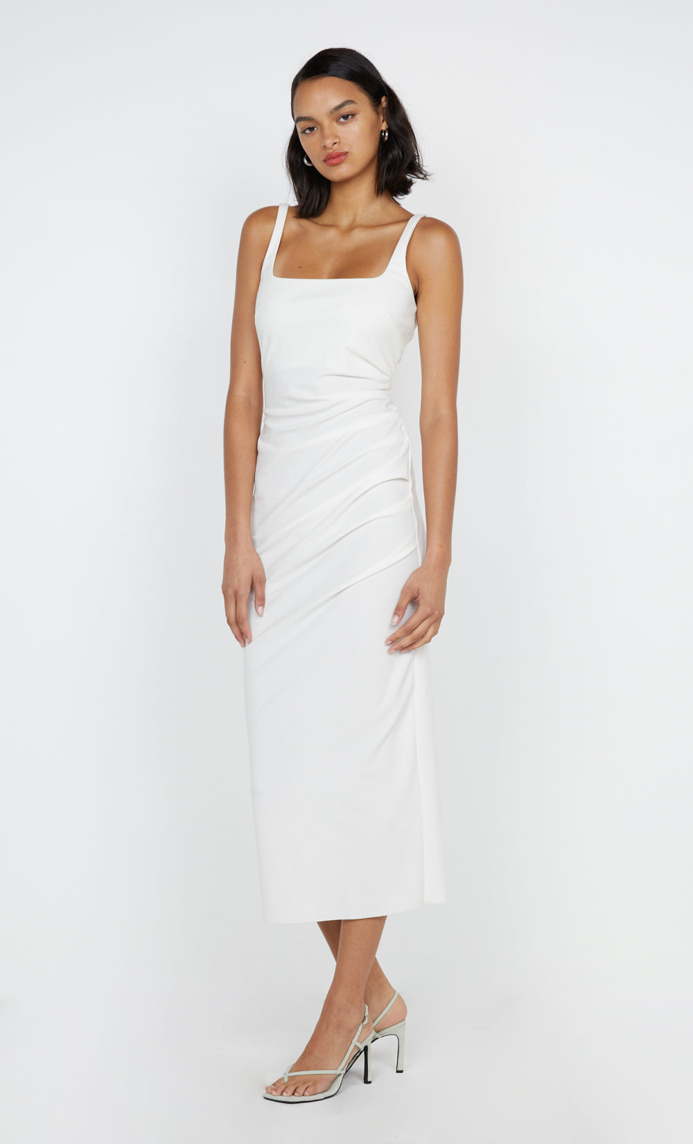 The BEC + BRIDGE Aveline Tuck Midi Dress in White features our signature square neck silhouette crafted from lightweight fabric. With a low scooping back and side tuck detailing at the waist and hips, this dress offers a refined look perfect for day-to-night styling.