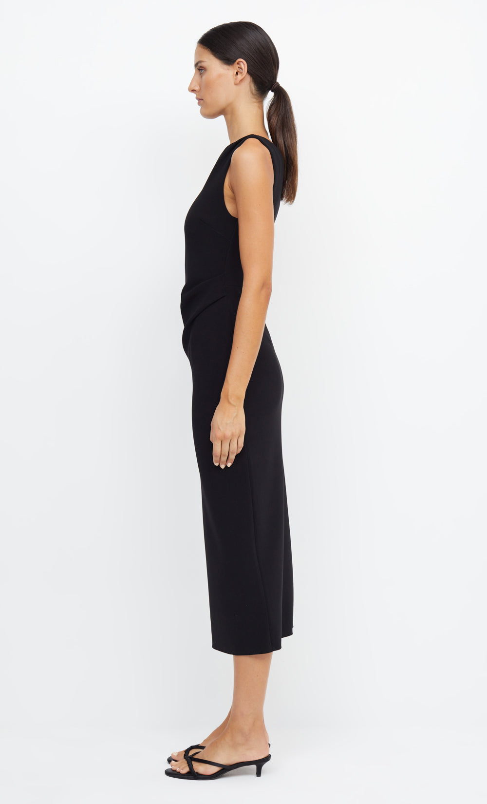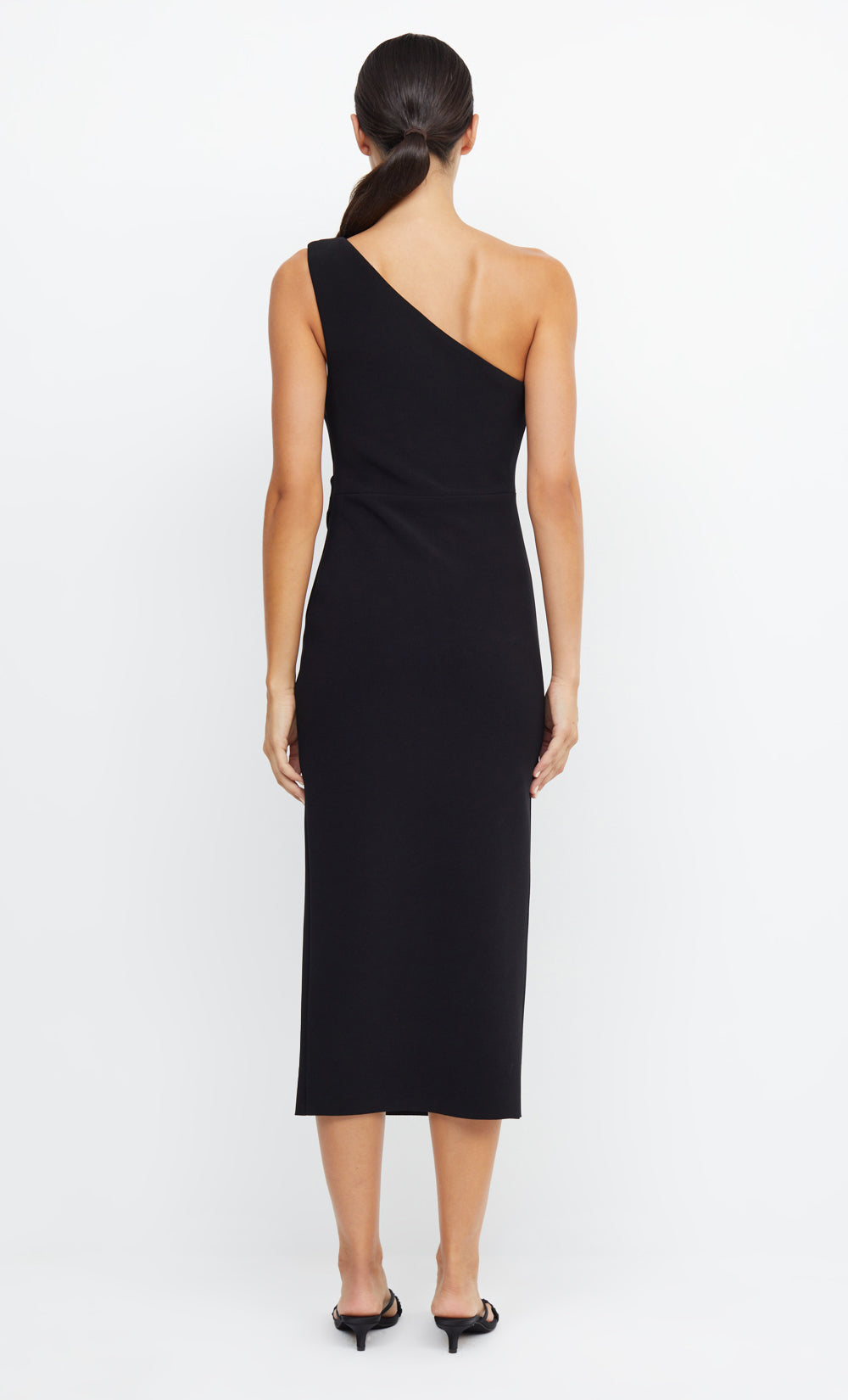 An easy to wear asymmetrical midi dress cut from a stretch bonded crepe fabric that cinches in the body and skims the silhouette. The one shoulder dress features a slight gathering detail at the waist and hips for a more comfortable fit.