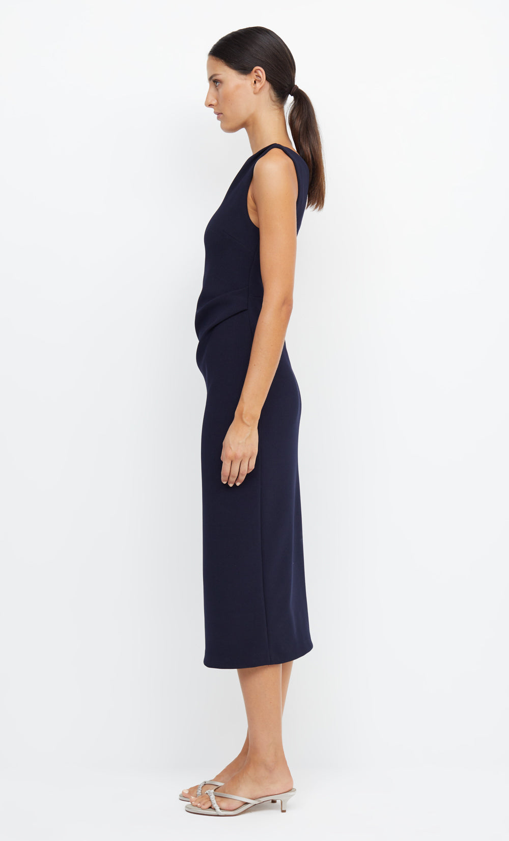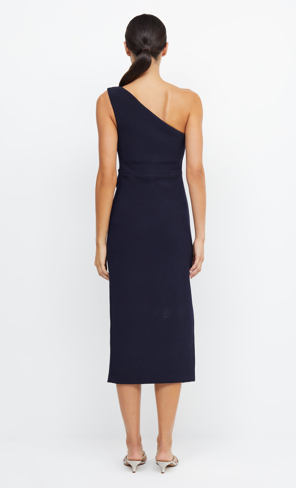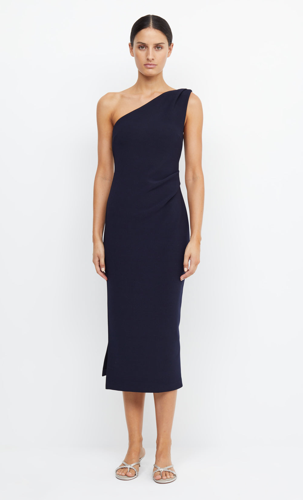 An easy to wear asymmetrical midi dress cut from a stretch bonded crepe fabric that cinches in the body and skims the silhouette. The one shoulder dress features a slight gathering detail at the waist and hips for a more comfortable fit.