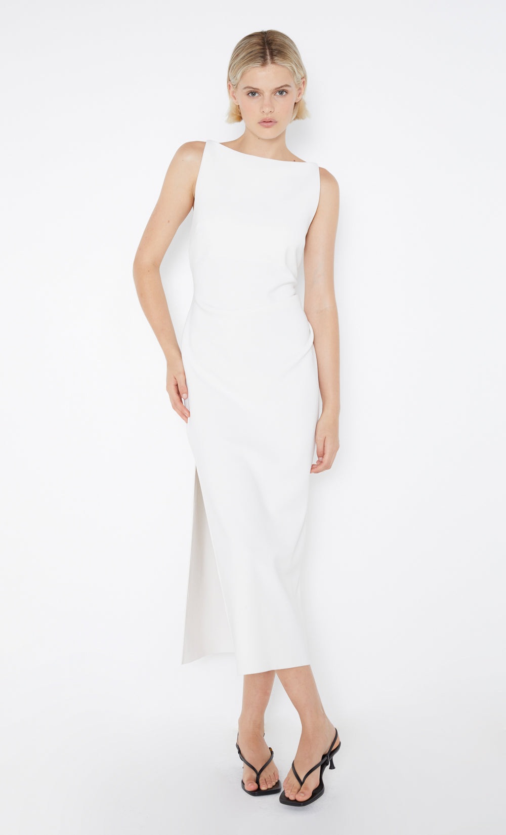 Sleeveless high neck midi in a timeless silhouette that flatters all body shapes. The midi dress is cut from a stretch bonded crepe fabric that cinches in the body and skims the silhouette. The Be Mine Tuck Midi Dress features a slight gathering detail at the waist and hips for a more comfortable fit.