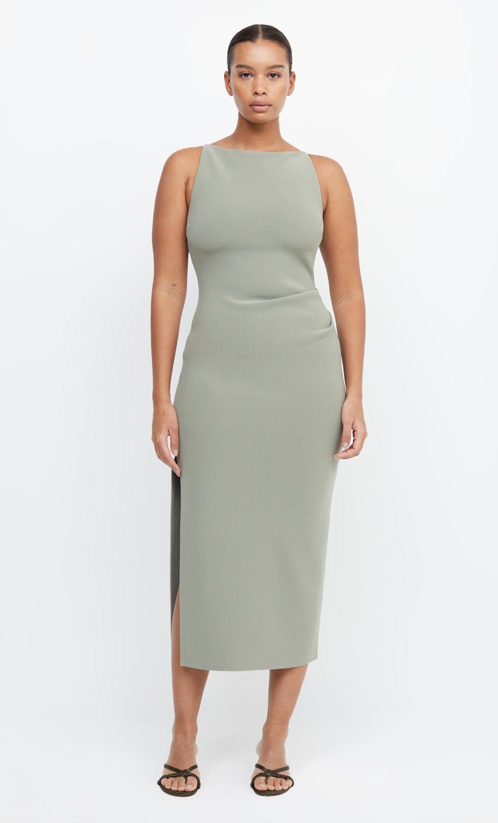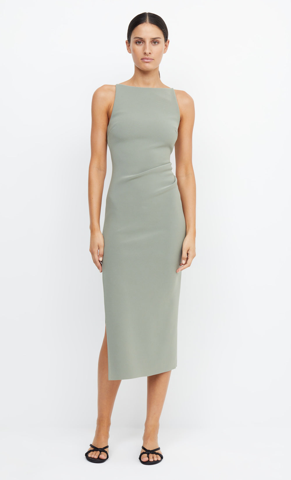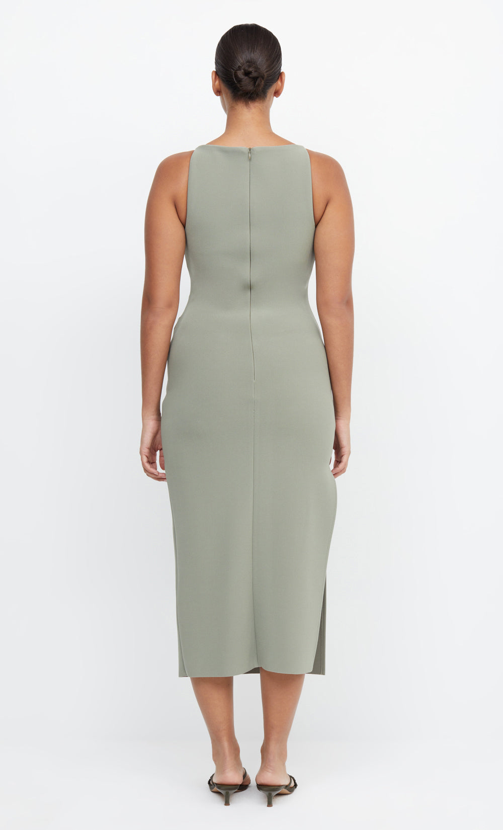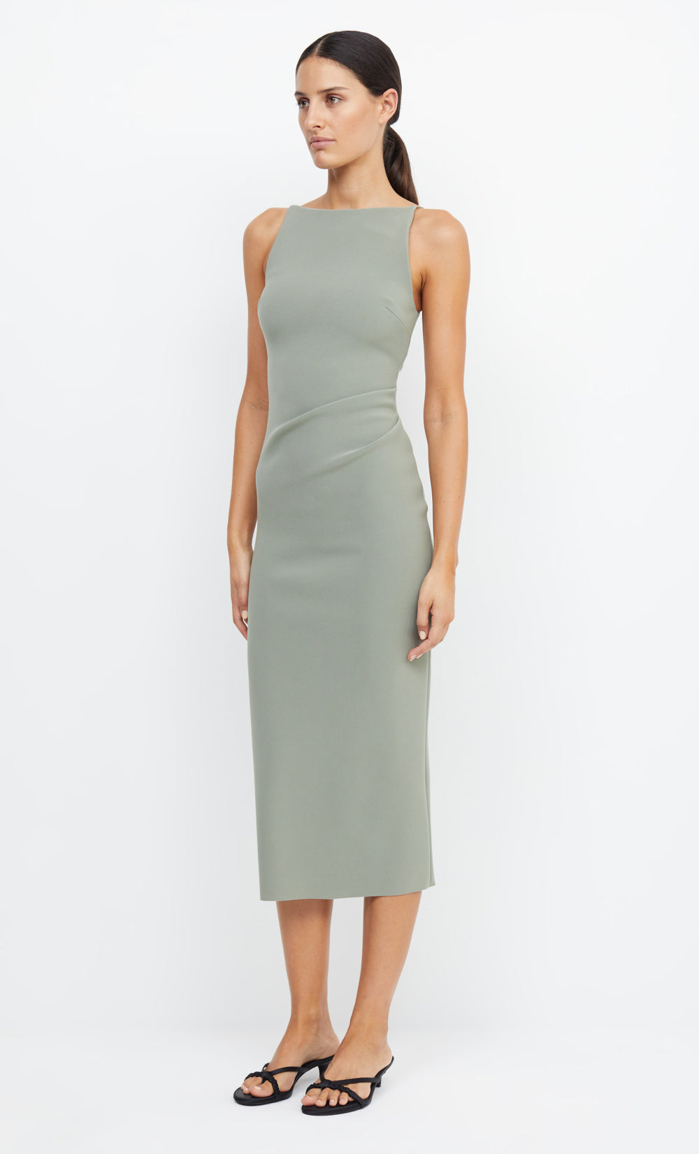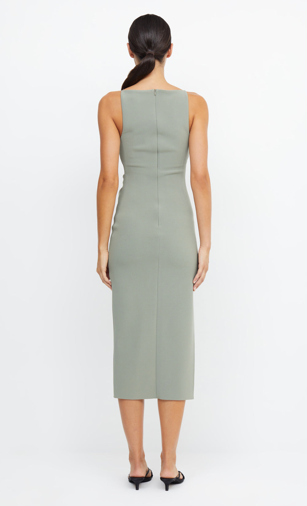 Sleeveless high neck midi in a timeless silhouette that flatters all body shapes. The midi dress is cut from a stretch bonded crepe fabric that cinches in the body and skims the silhouette. The Be Mine Tuck Midi Dress features a slight gathering detail at the waist and hips for a more comfortable fit.