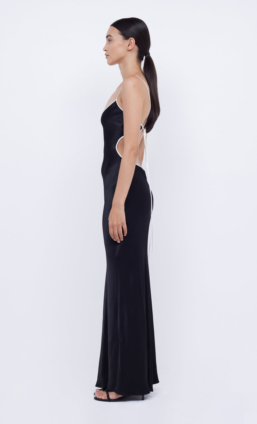 A bestselling design, the BEC + BRIDGE Cedar City Maxi Dress is a slinky V-neck style with a keyhole cut-out detail and contrast binding that carries through straps to tie-back. The bias-cut maxi is finished with a rolled hem, and an adjustable knotted strap which can be loosened and tied at desired length.