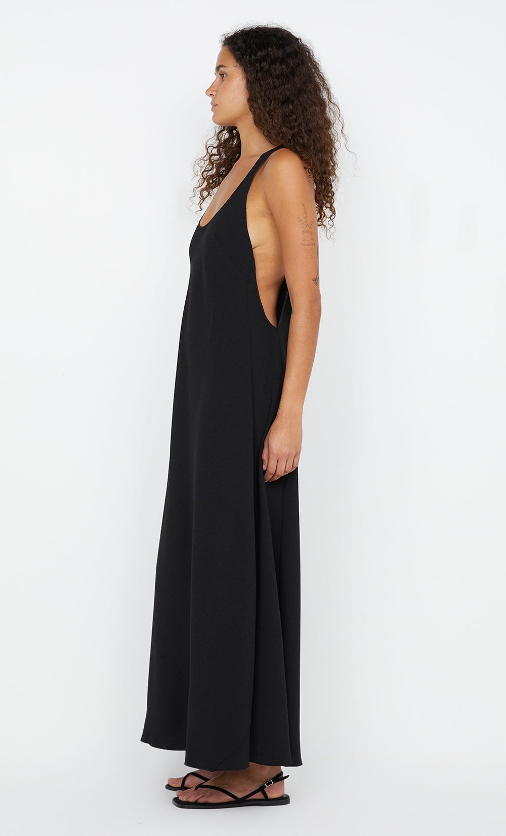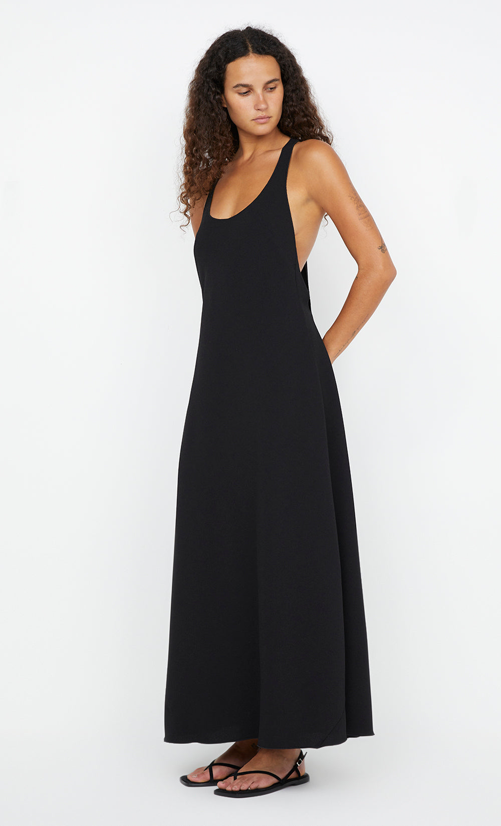 The BEC + BRIDGE Delainey Maxi Dress in Black is an effortlessly chic piece designed for a modern, relaxed look. Featuring a scoop neckline, twisted back detail, and low-cut sides, this maxi dress offers a striking silhouette. The relaxed fit and babylocked edge finish add to its understated elegance, while the pull-on styling ensures ease and comfort. Ideal for casual summer outings, beachside dinners, or relaxed evening events.