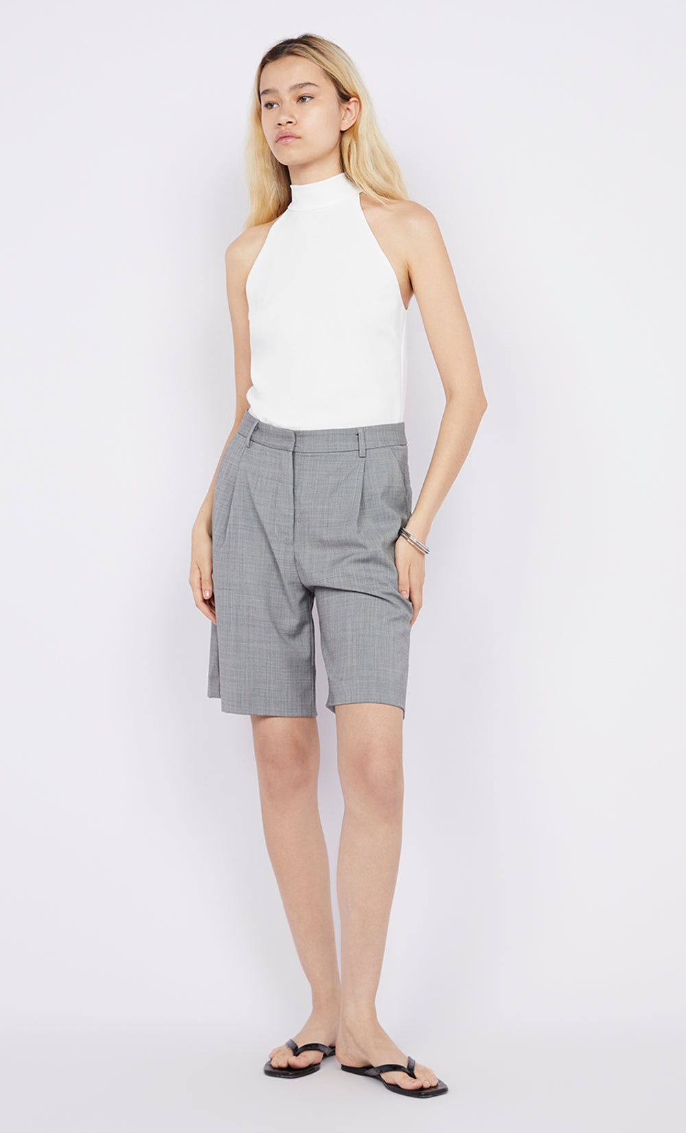 The BEC + BRIDGE Elain Racer Top in White is a sophisticated halter top with neckband detail, a racer back silhouette, and self-ties at the neck. Style with BEC + BRIDGE Jordin Short for an elevated everyday look.