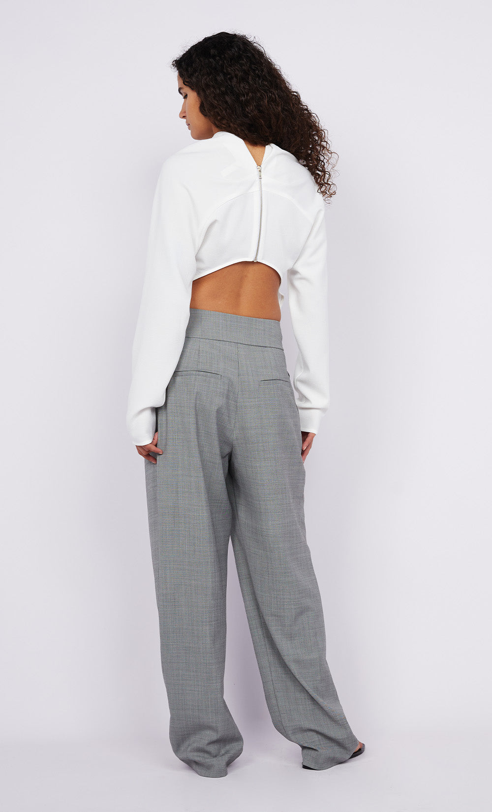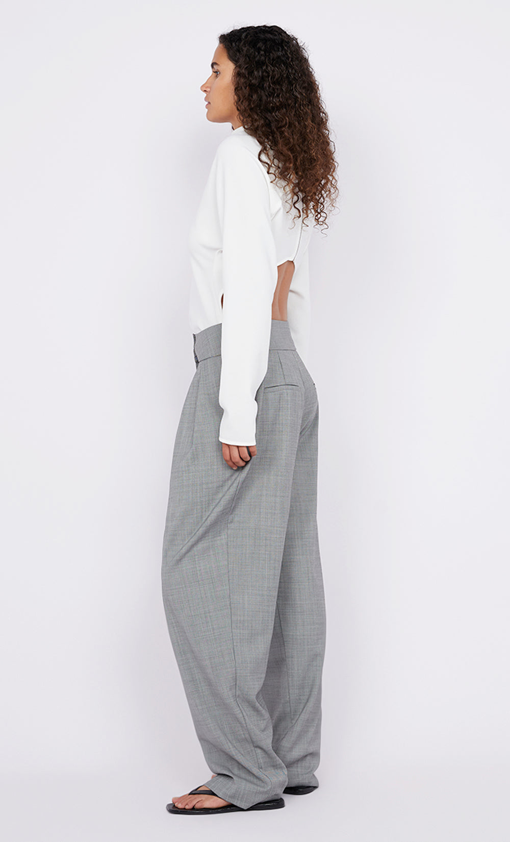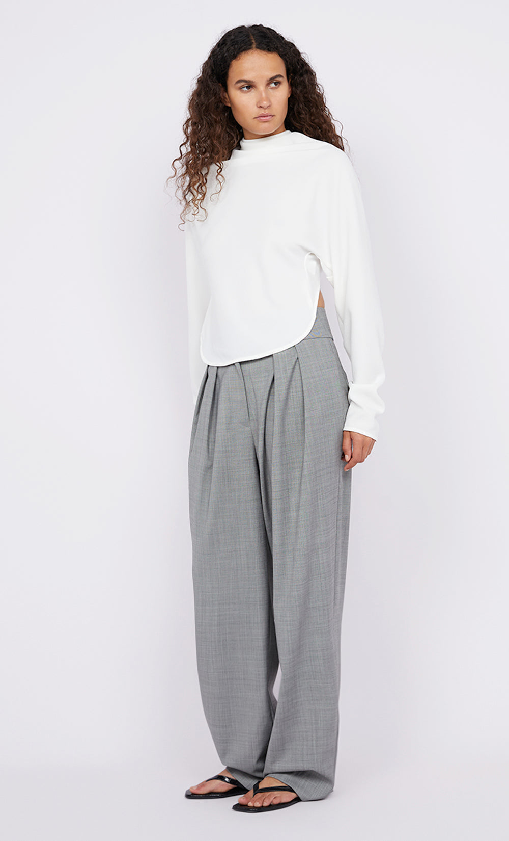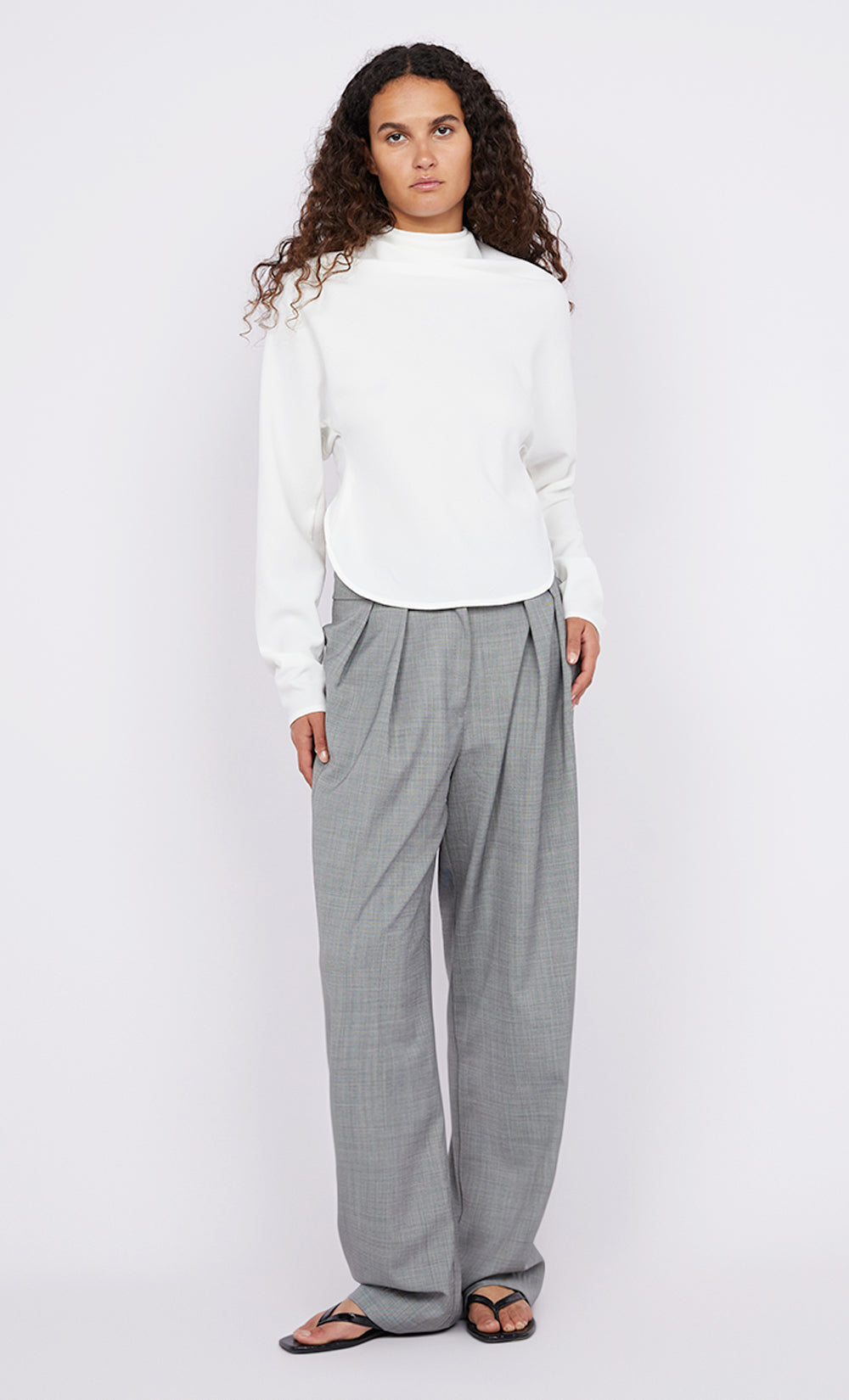 The BEC + BRIDGE Elain Top in White has a refined silhouette that is complimented by an unexpected flair. This long sleeve top features a high neckline with tucks at the side seams which are accented by an open back feature. Designed to take you from work to the weekend, style yours with jeans or pants.