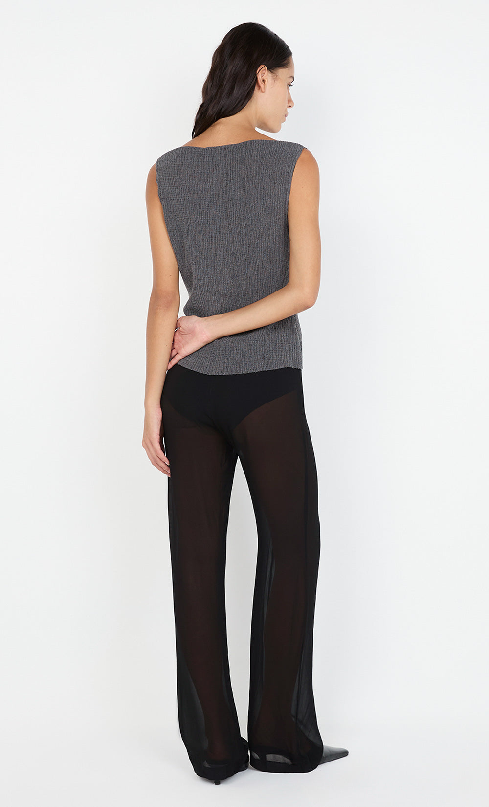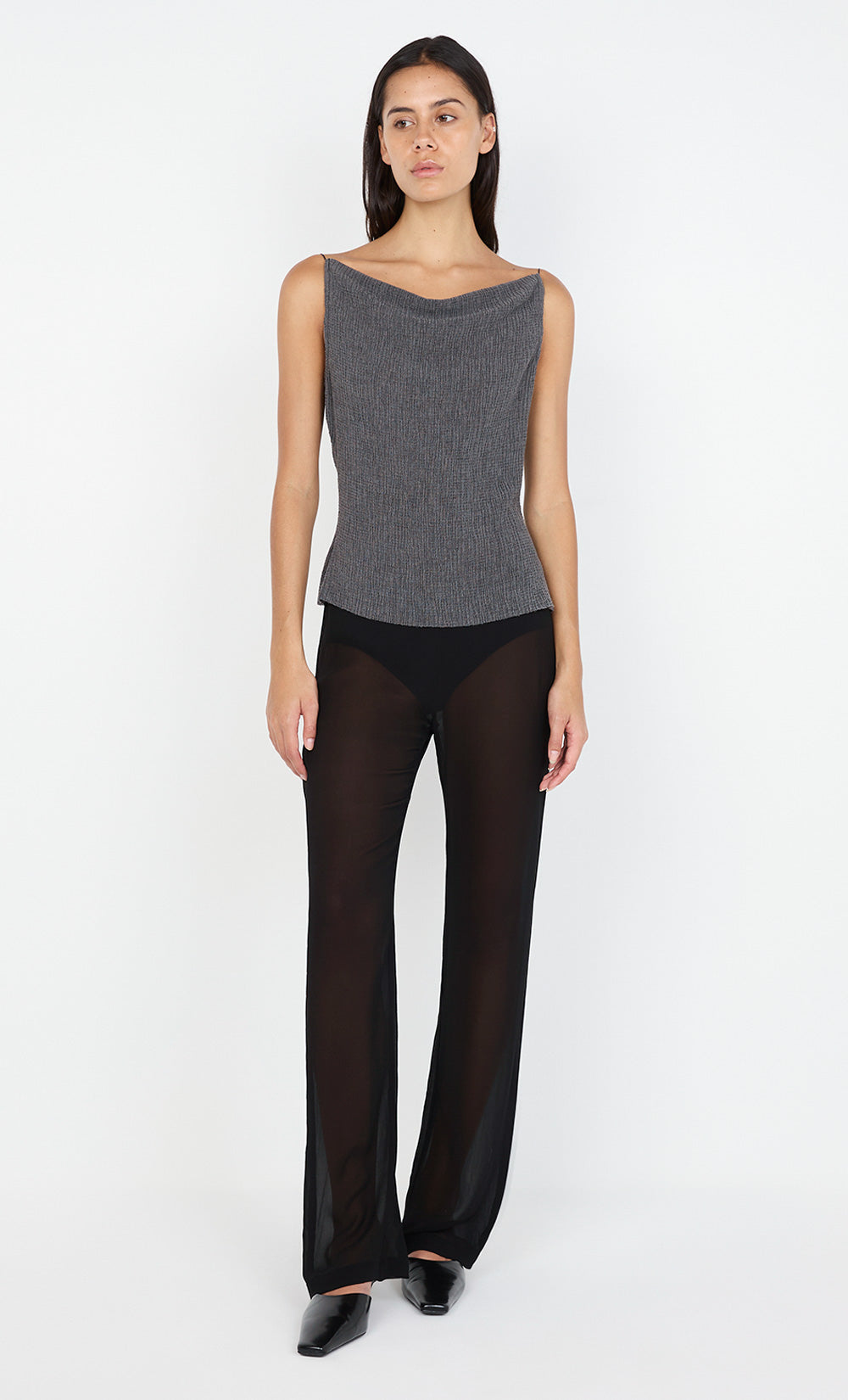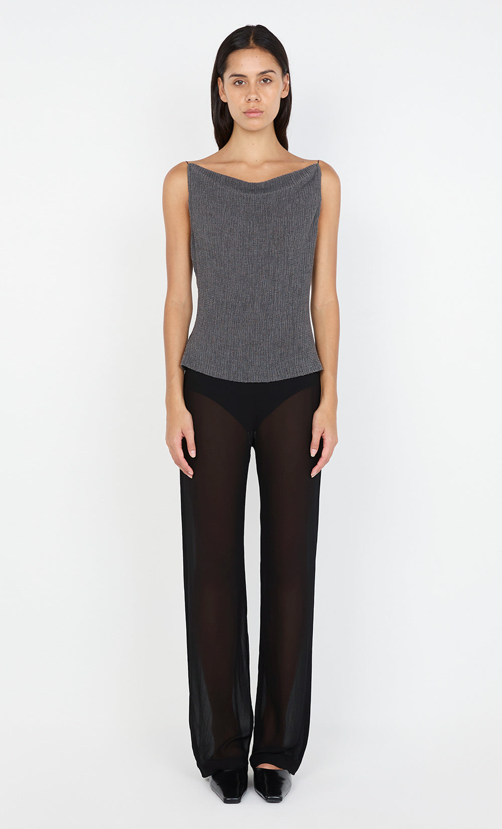 The BEC + BRIDGE Elena Boat Neck Top in Charcoal is a sleek and modern piece designed for a fitted silhouette. Featuring a flattering boat neckline and delicate thin cord shoulder straps, this top offers a sophisticated yet relaxed look. The textured fabric provides stretch, ensuring a comfortable and contoured fit. With its pull-on styling and raw hem finishing at the hips, this top pairs perfectly with the Elena Maxi Skirt for a chic, coordinated outfit.