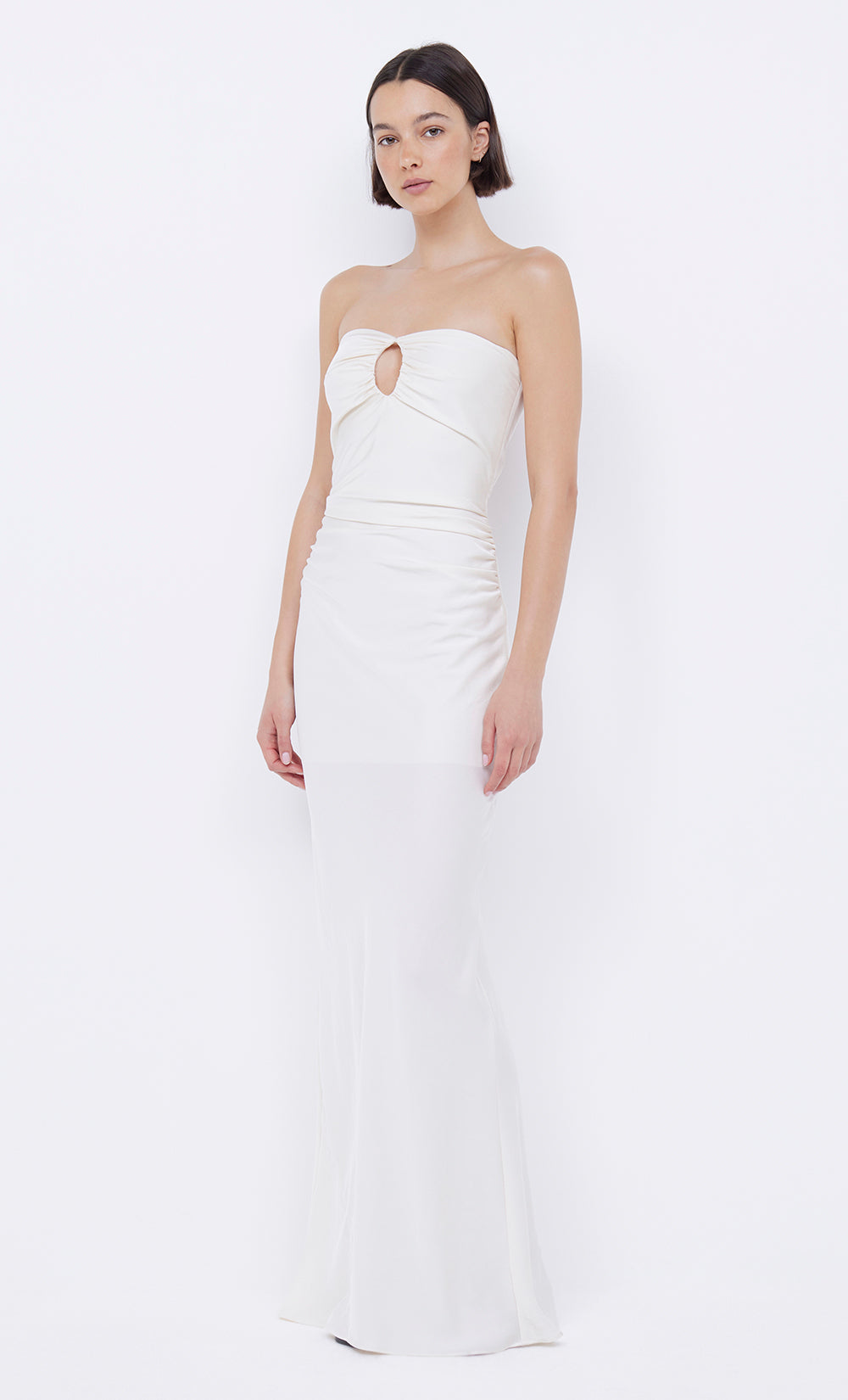 The Emilia Strapless Dress is an elegant and classic style. The dress features a keyhole cutout at centre bust, ruching at the cinched waist to create a flattering silhouette and falls into a bias cut maxi skirt.
