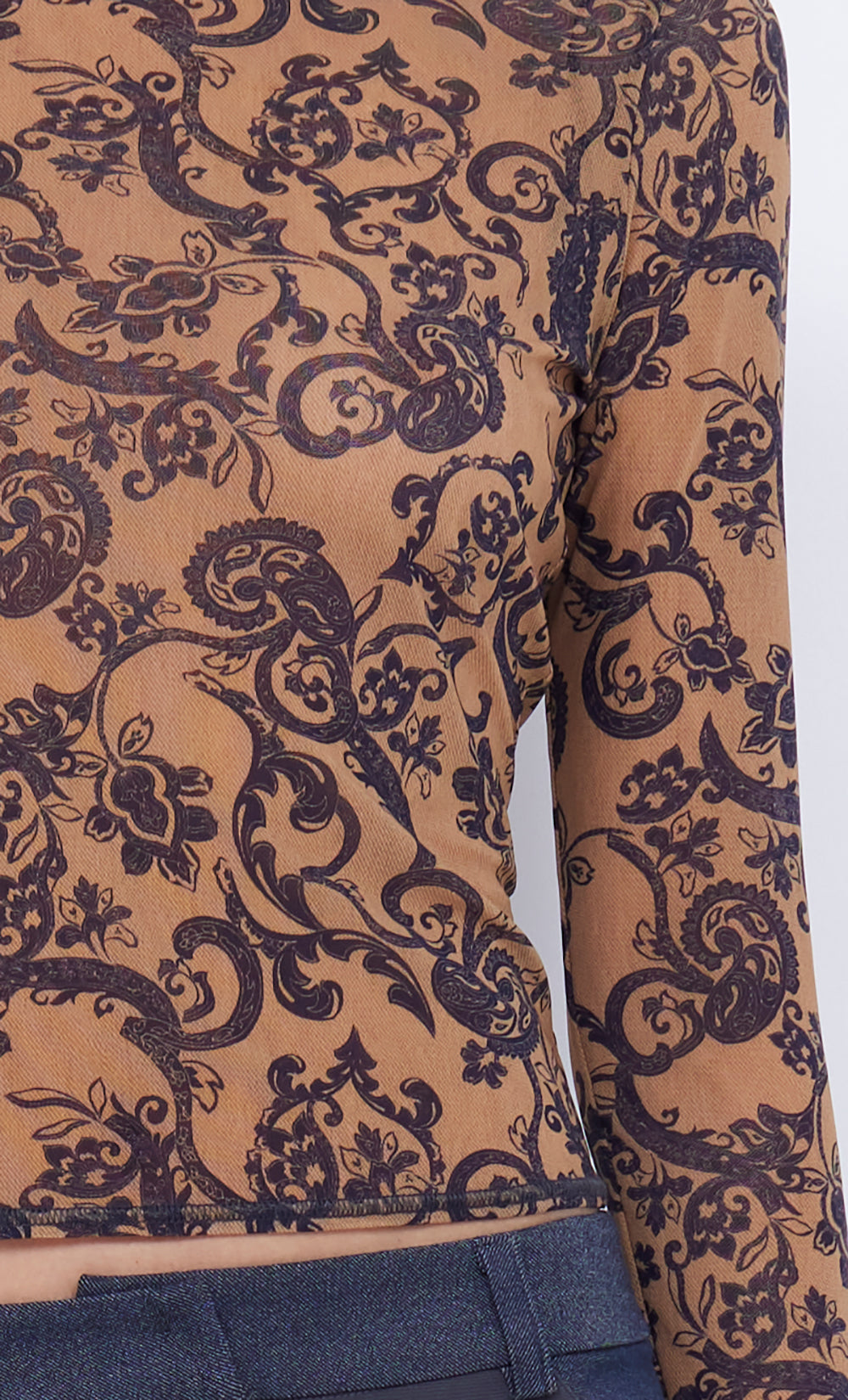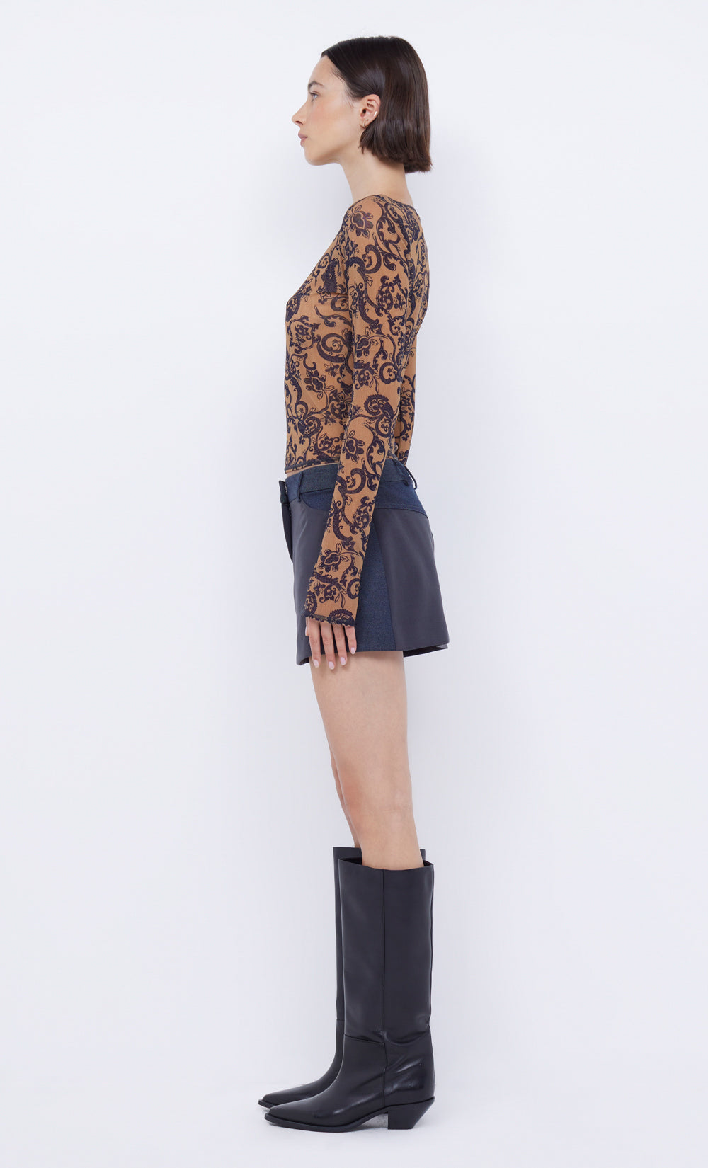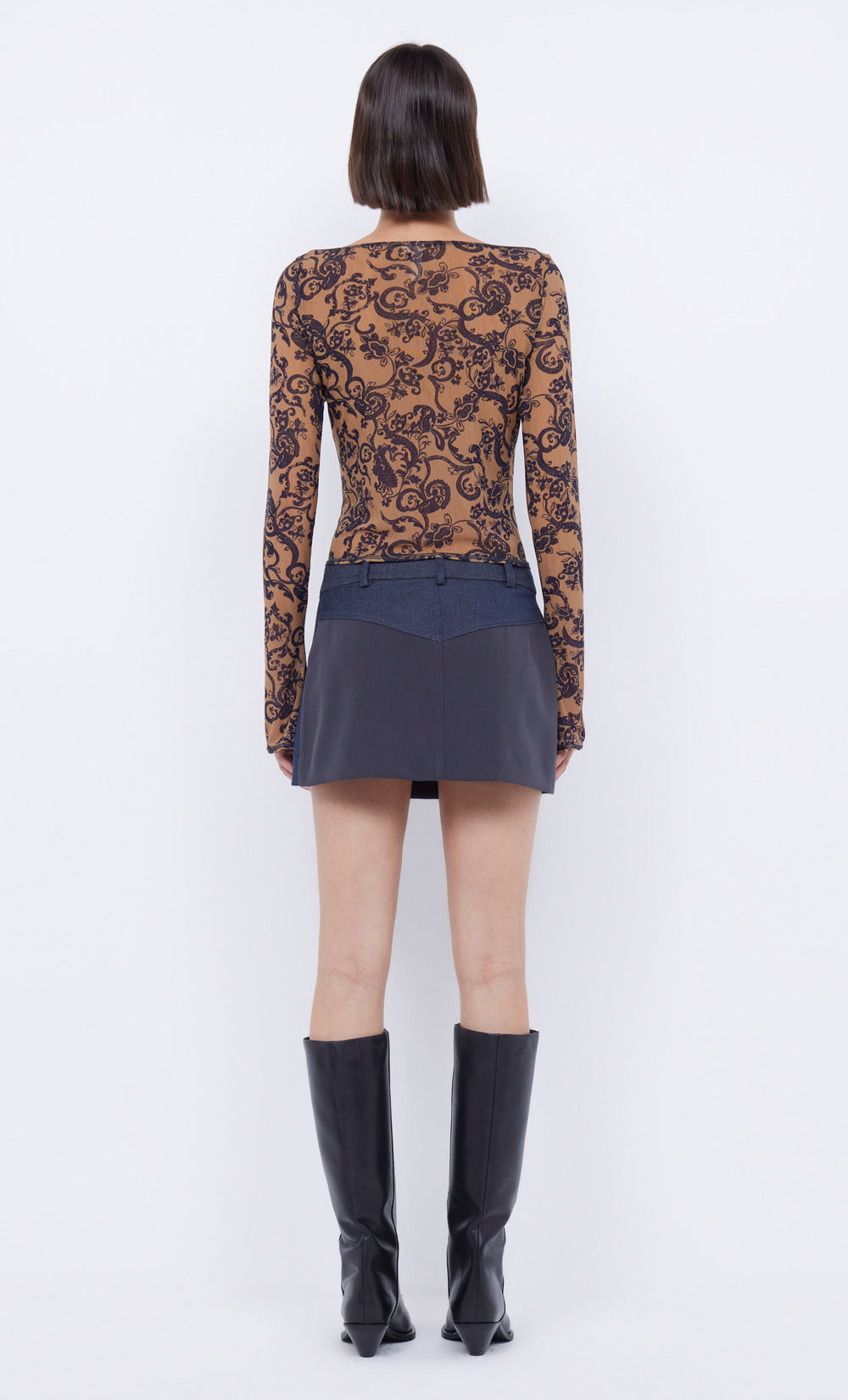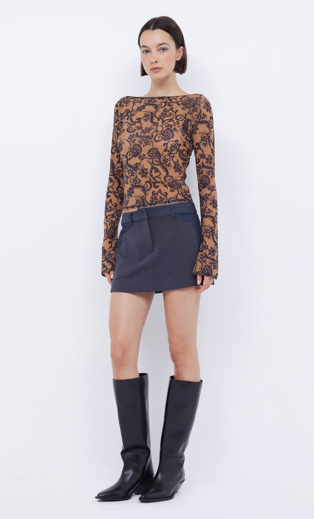 The BEC + BRIDGE Fleur De Lis Long Sleeve Top is crafted from a printed mesh, semi sheer fabric in a classic silhouette. The top features a boat neckline and is finished with flatlock overlocked edges. Styled with BEC + BRIDGE Wynona Paneled Mini Skirt.