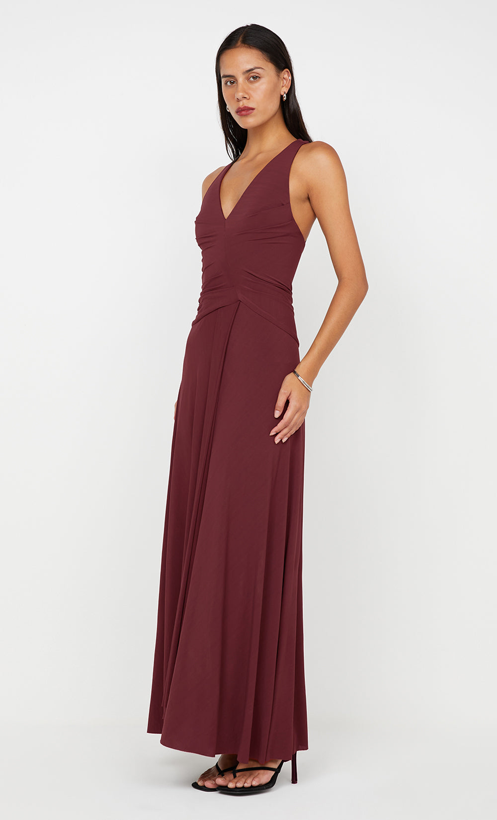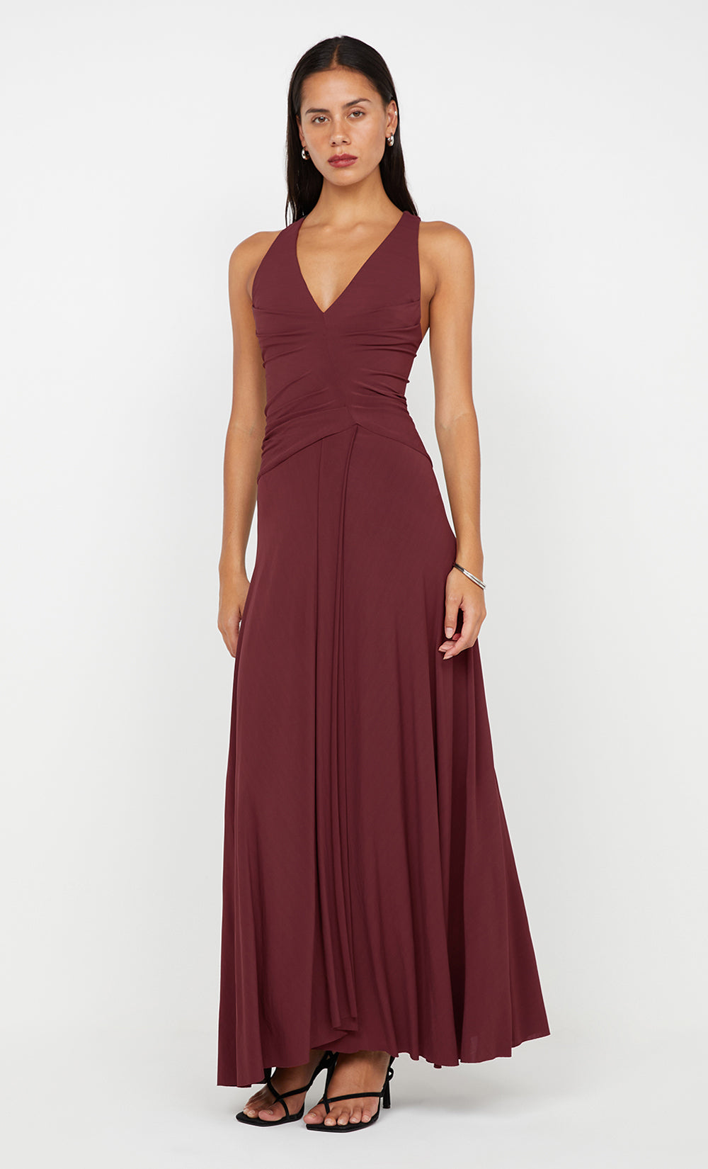 The BEC + BRIDGE Greta Gown in Cherry Cola is an effortless V-neck maxi dress. Featuring a racerback silhouette with tucks at the centre back and a diagonal centre seamline that accentuates the drop waist before falling into a relaxed skirt. Wear yours with BEC + BRIDGE Kate Heel for your next event.