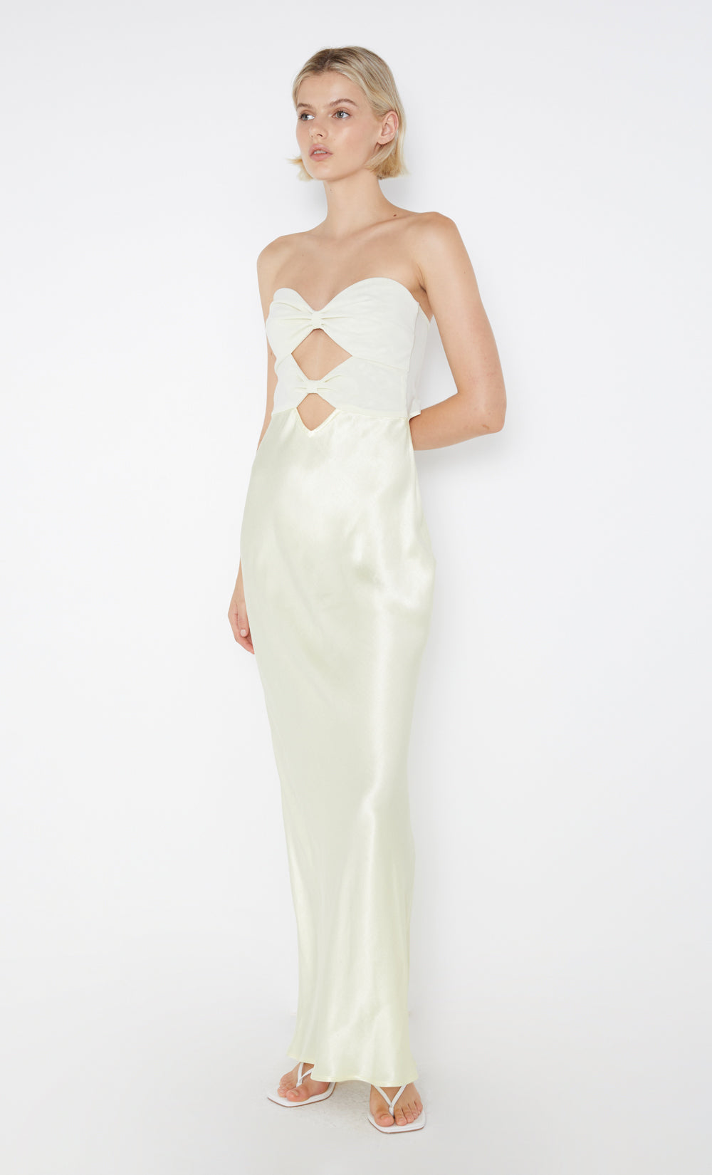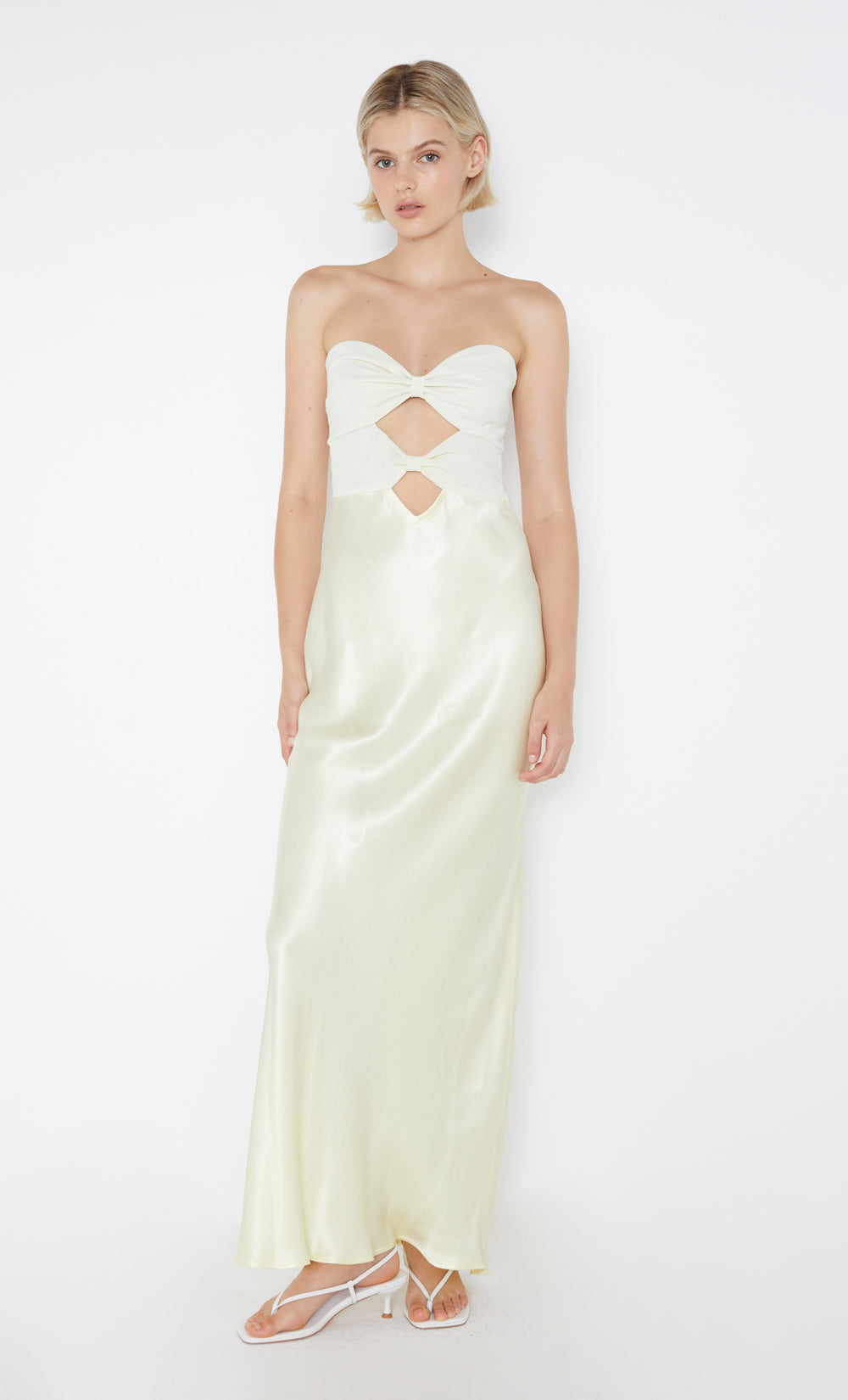 A statement eventwear style, the BEC + BRIDGE Halle Strapless Dress features gathered detailing on bust, chic cut-outs and a contrasting mesh back panel. The maxi dress is finished with a rolled hem. This garment is certified Australian made.