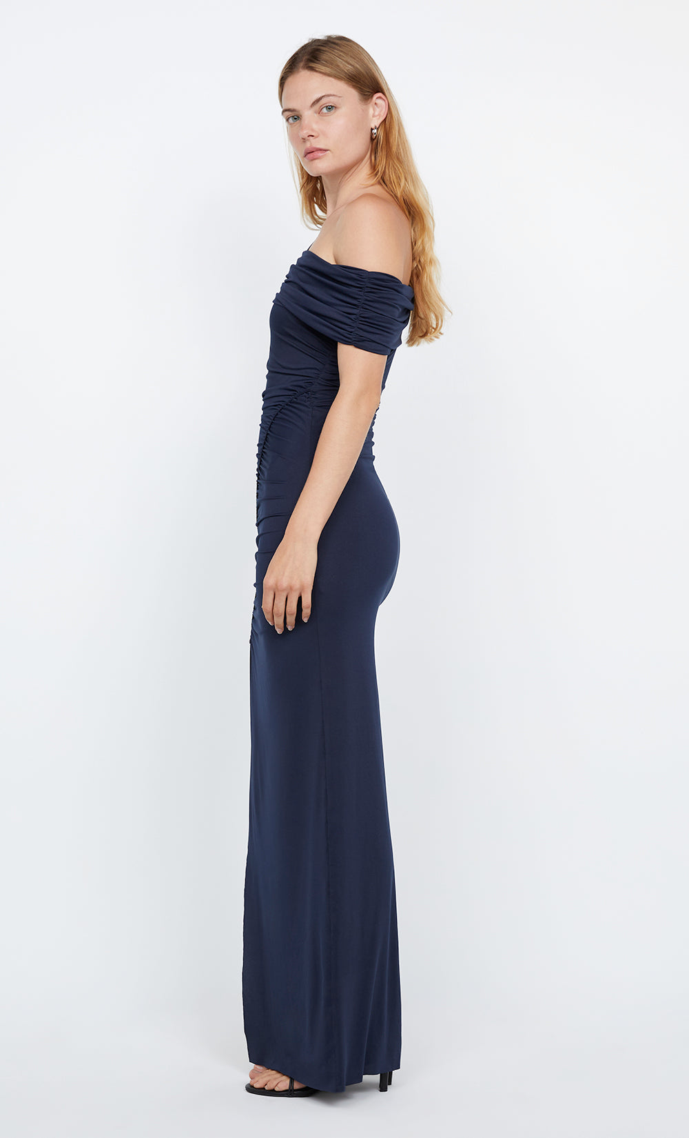 BEC + BRIDGE Imogen Asym Maxi Dress is crafted from soft jersey fabric, offering a sleek and fitted silhouette that flows into a straight maxi dress.