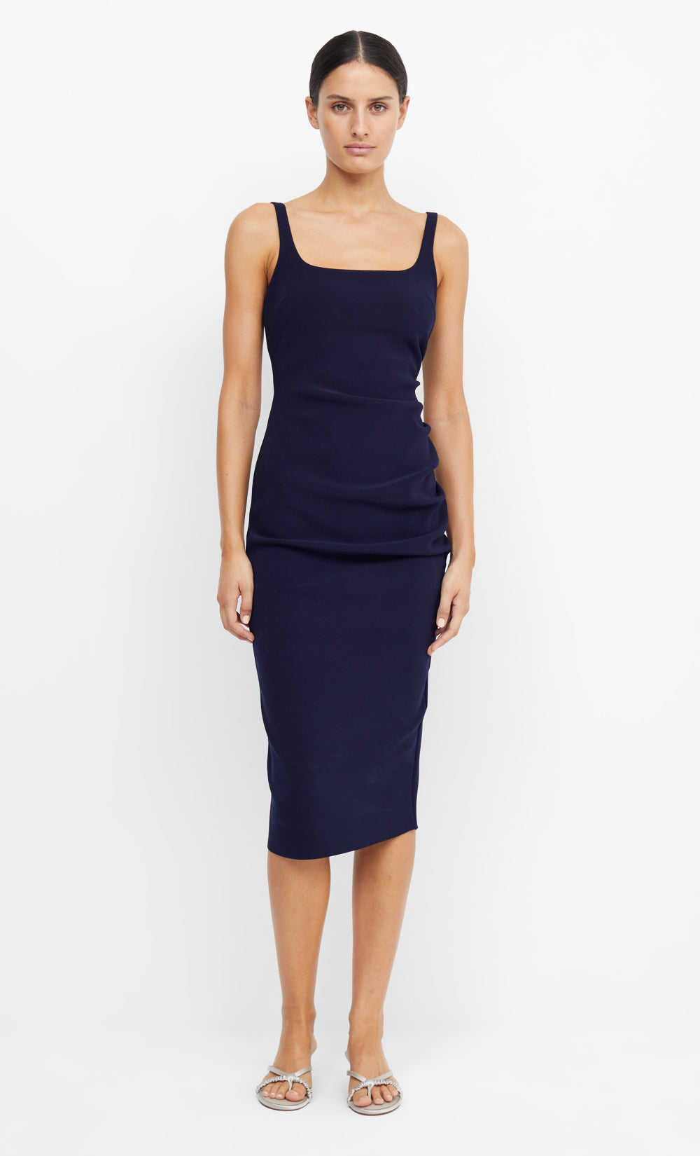 A timeless square neck midi dress with a low scoop back. The stretch bonded crepe fabric and side tuck detailing at the waist and hips of the dress create a very easy to wear and flattering silhouette for all body types.