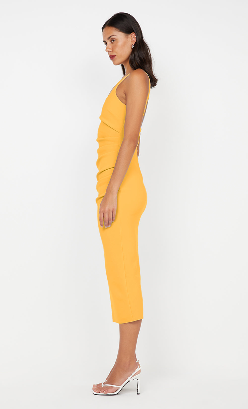 A timeless square neck midi dress with a low scoop back. The stretch bonded crepe fabric and side tuck detailing at the waist and hips of the dress create a very easy to wear and flattering silhouette for all body types.