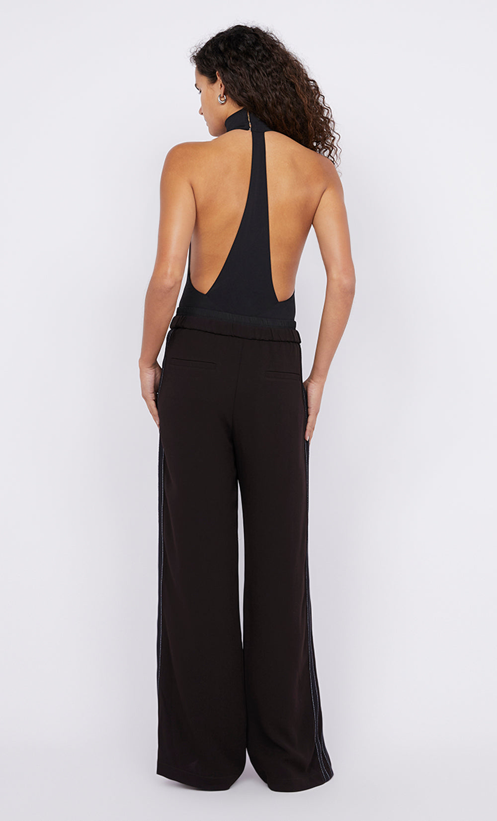 The BEC + BRIDGE Larsen Racer Bodysuit in Black combines elegance with an edge. This bodysuit features a sleek halter neckline with a structured band and a striking racerback. Soft gathers at the sides and center back enhance the silhouette. Pair yours with tailored pants for a chic evening look.