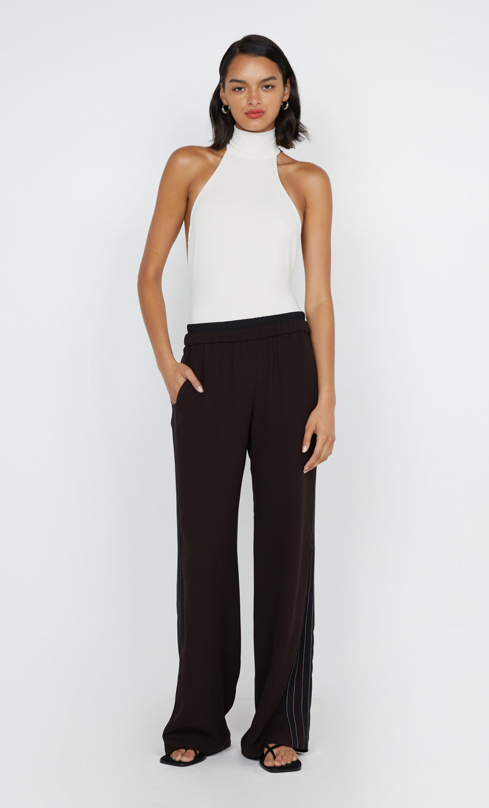 The BEC + BRIDGE Larsen Racer Bodysuit in Ivory combines elegance with an edge. This bodysuit features a sleek halter neckline with a structured band and a striking racerback. Soft gathers at the sides and center back enhance the silhouette. Pair yours with tailored pants for a chic evening look.