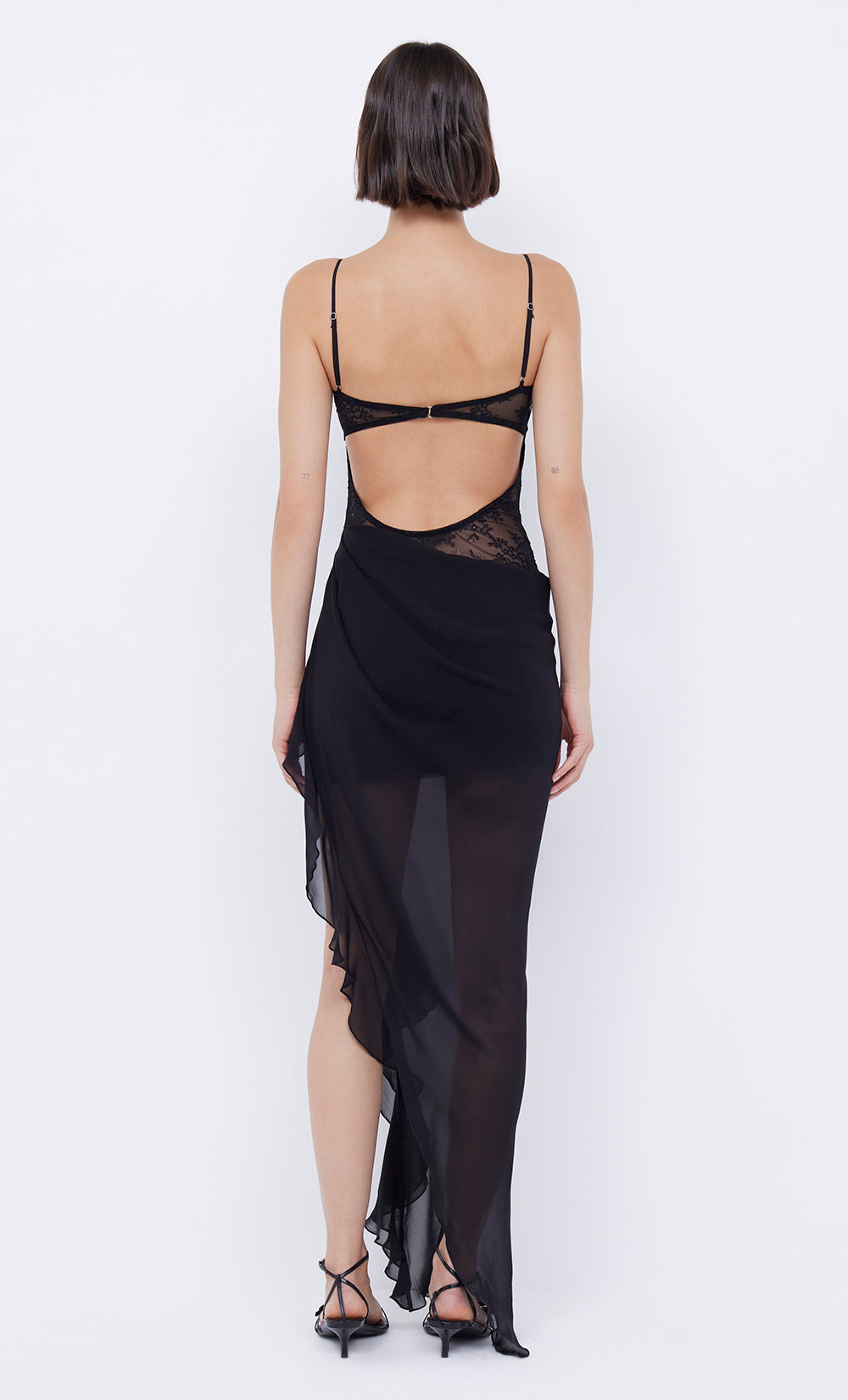 The BEC + BRIDGE Liv Asym Dress is a dreamy and flattering style perfect for that special occasion. Designed as a maxi dress with a stretch lace mini dress underlay, this style features delicate draping over the bust and skirt with a cascading ruffle on the edge on the skirt. Including a mid thigh split, adjustable straps, and a finished with a scoop back with e hook closures.