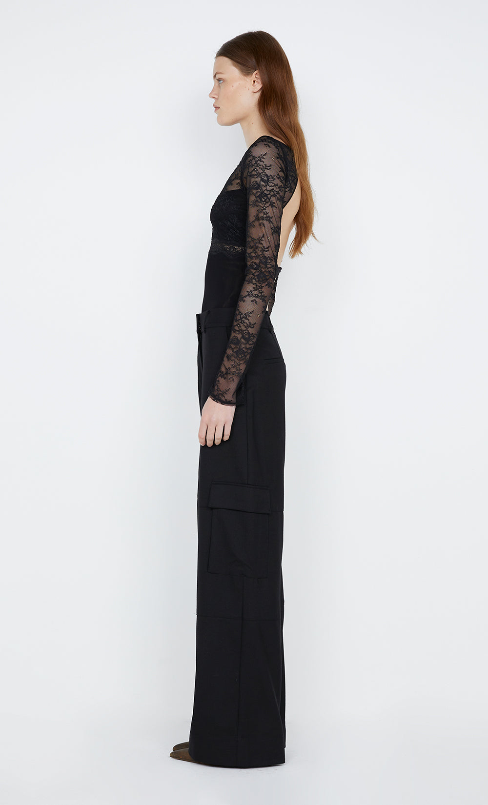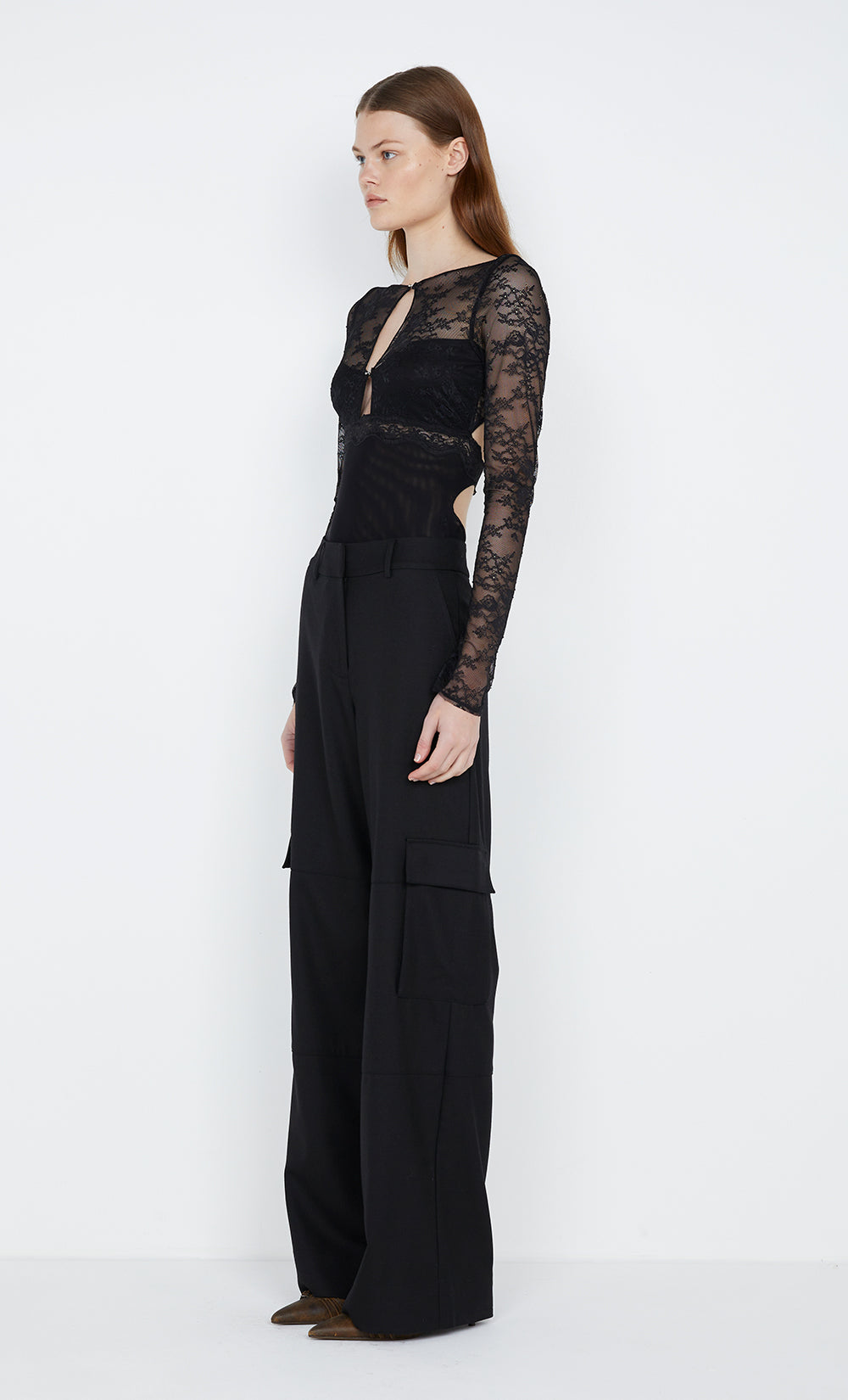 The BEC + BRIDGE Loani Long Sleeve Body Suit is a refreshing take on a cult classic. Featuring a bold stretch lace through the bust and sleeves and a flattering soft mesh through the bodice under the bust line, this gorgeous piece creates an effortless fitted silhouette. Adorned with a stylish keyhole cutout and splits at the wrists. Styled with BEC + BRIDGE Nevada Pocket Pant.