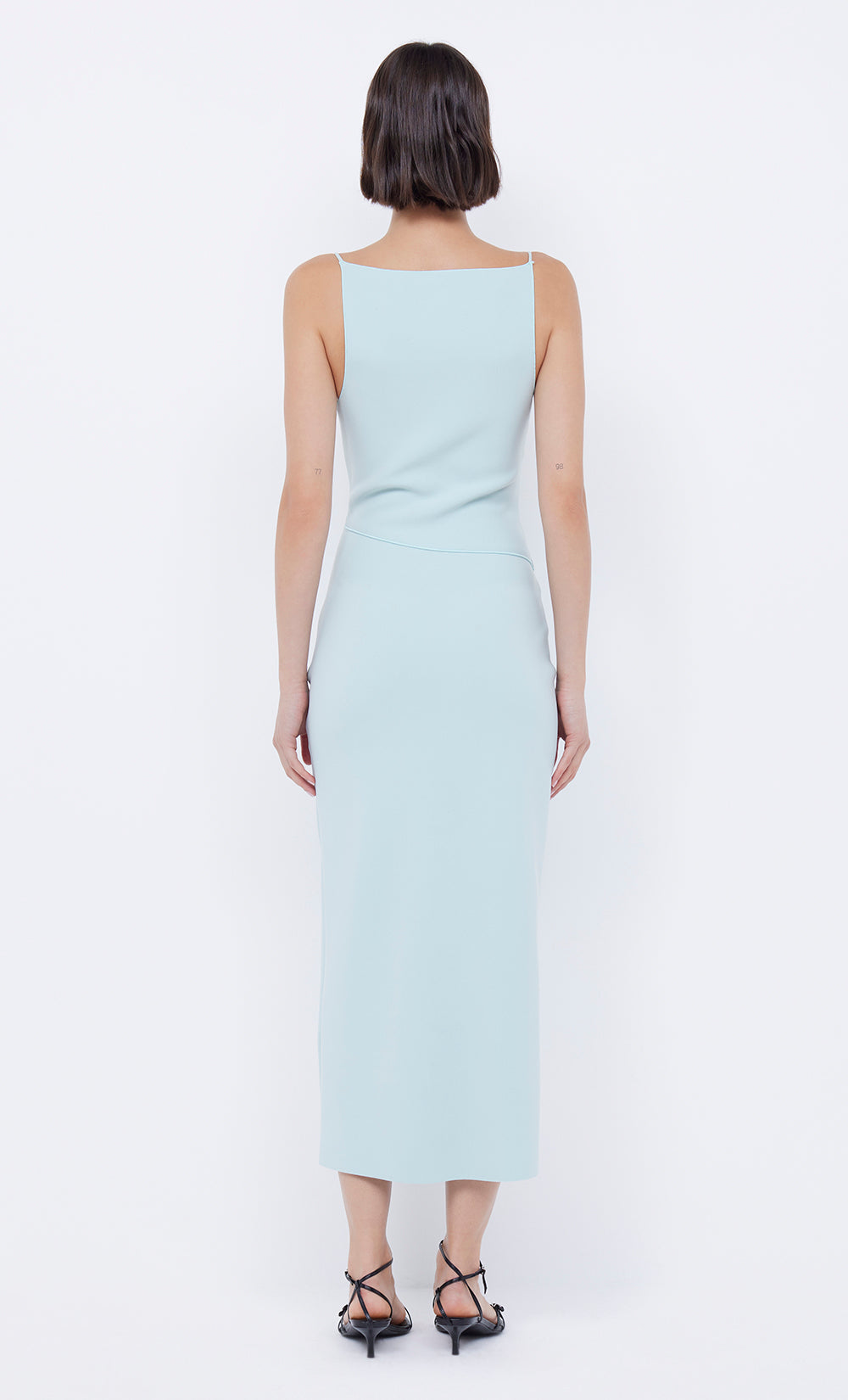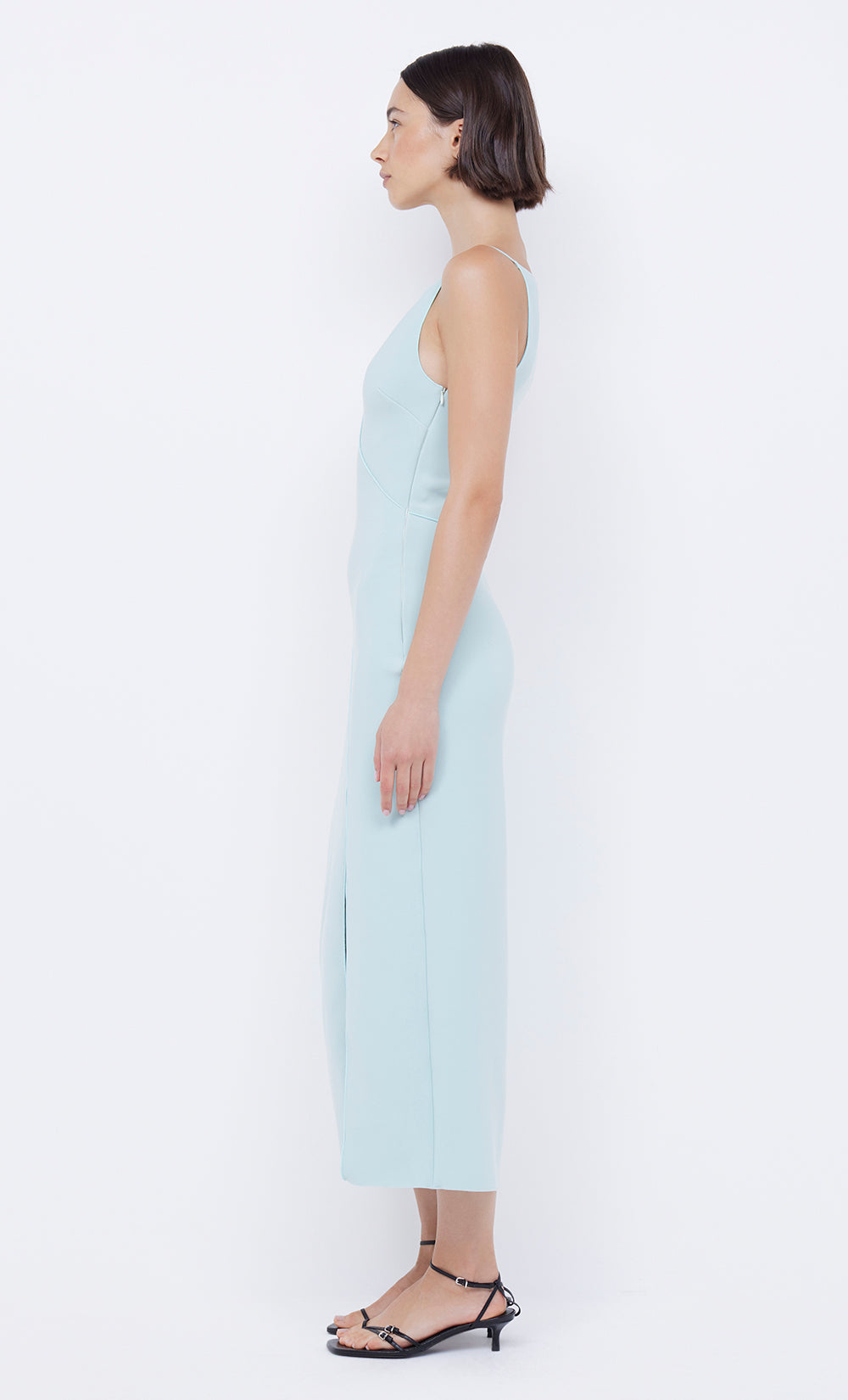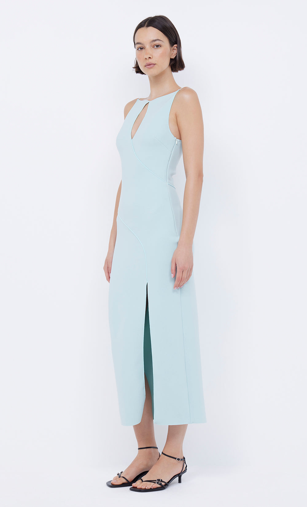 The BEC + BRIDGE Marielle Split Dress is cut from our signature stretch bonded crepe fabric in a classic silhouette. The midi dress features a high cut, straight neckline that flatters the silhouette and statement keyhole cutout detail at the centre front, with a front thigh high split.