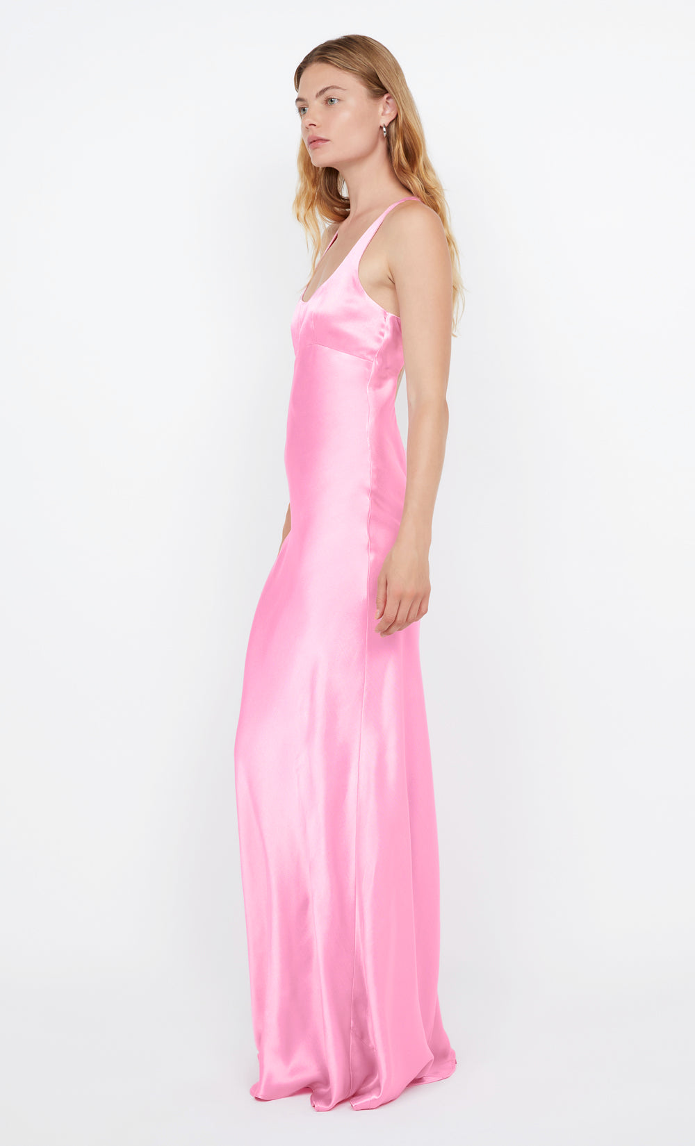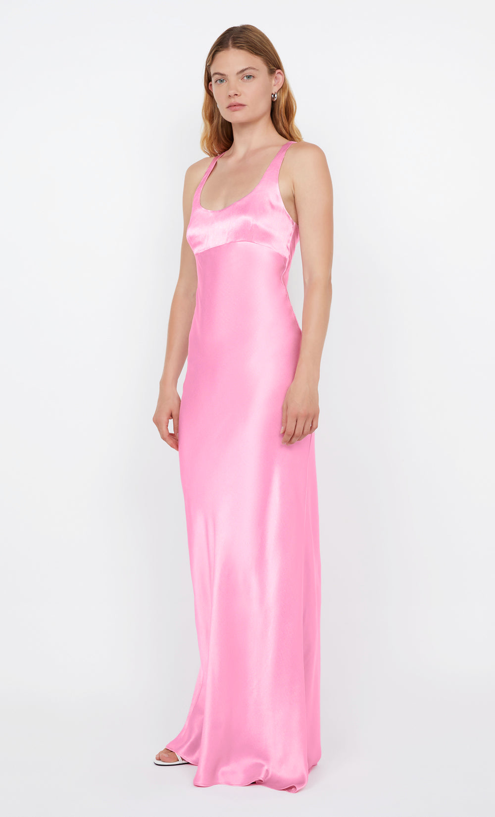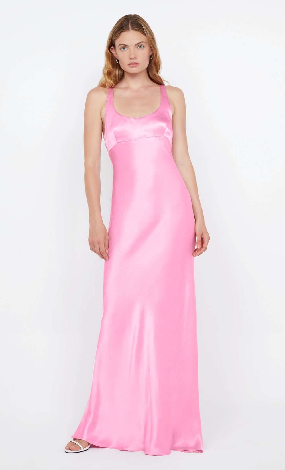 The BEC + BRIDGE Maxina Crossover Dress in Candy Pink is a timeless, yet elegant maxi silhouette, perfect for that special occasion. Cut on the bias to skim the silhouette, this maxi dress features a halter neckline and bust darts. Cross over back strap details and an open back enhance the details of the dress. Styled with BEC + BRIDGE Kate Heel.