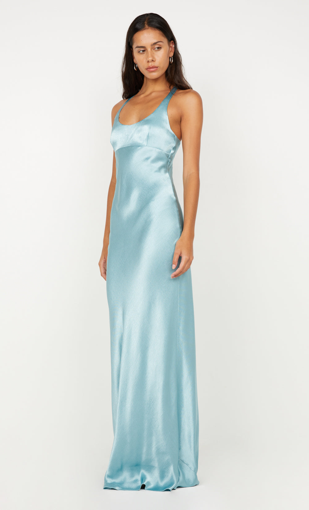 The BEC + BRIDGE Maxina Crossover Dress in Sea Spray is an elegant choice for your next formal event. Cut on the bias from our signature light-catching Katella fabric, this maxi dress features a scoop neckline and a sophisticated crossover back detail.