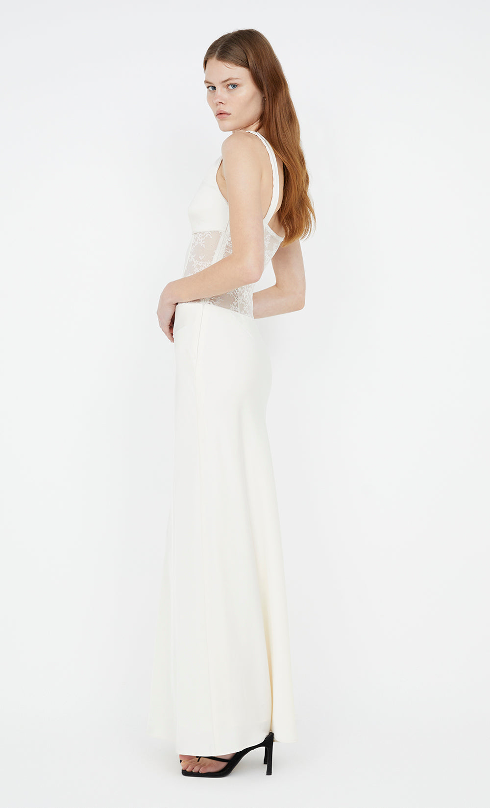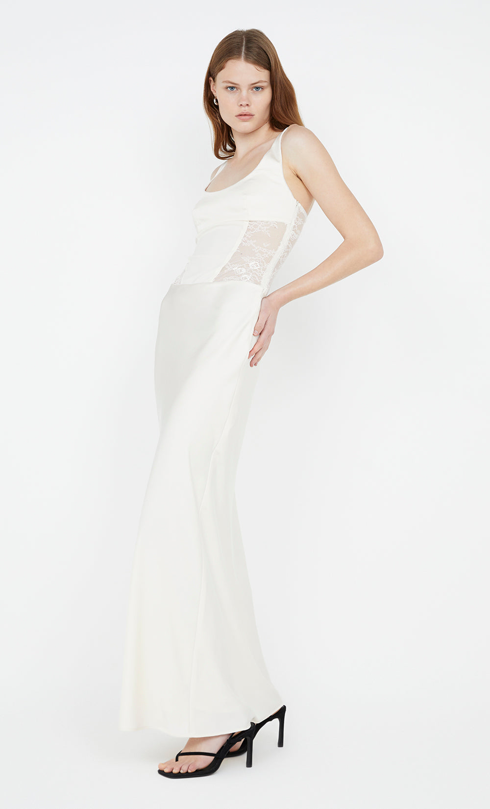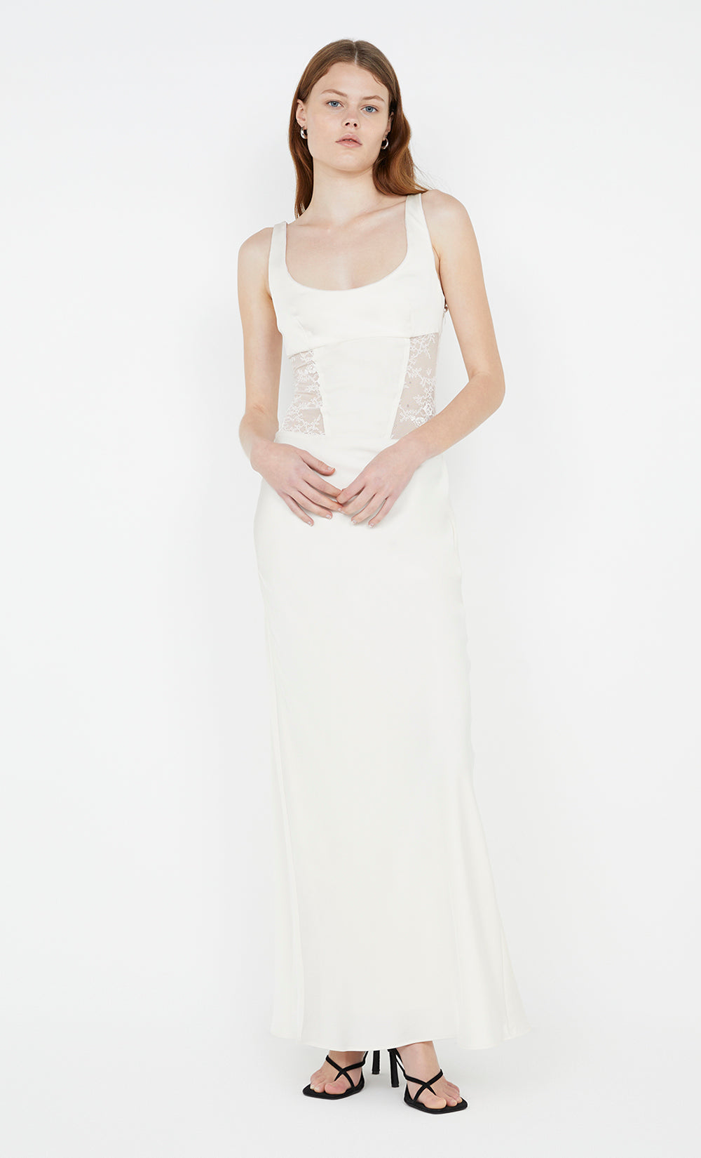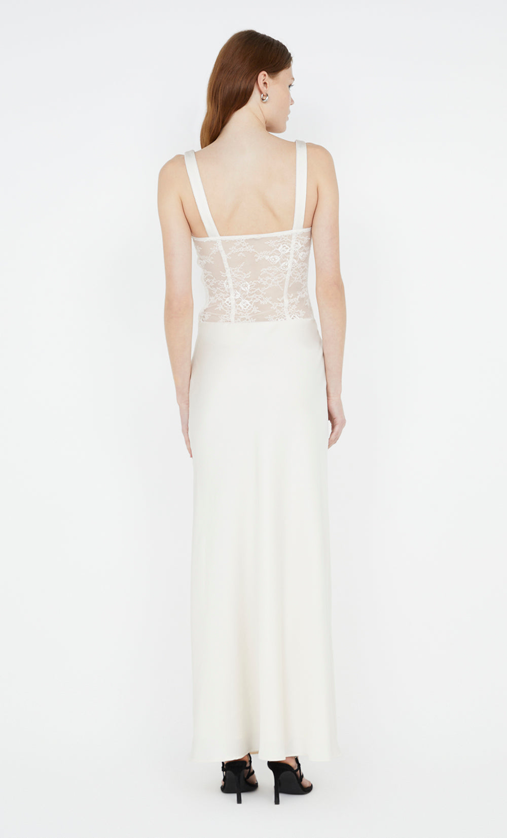 The BEC + BRIDGE Olympia Corset Dress is a modern revival of a classic silhouette. This maxi dress features a scoop neckline, wider straps, and an underbust seam for added support. Detailed with lace panels and corset-style seams at the sides of the waist, the dress is cut on the bias, allowing the skirt to fall into a relaxed fit.