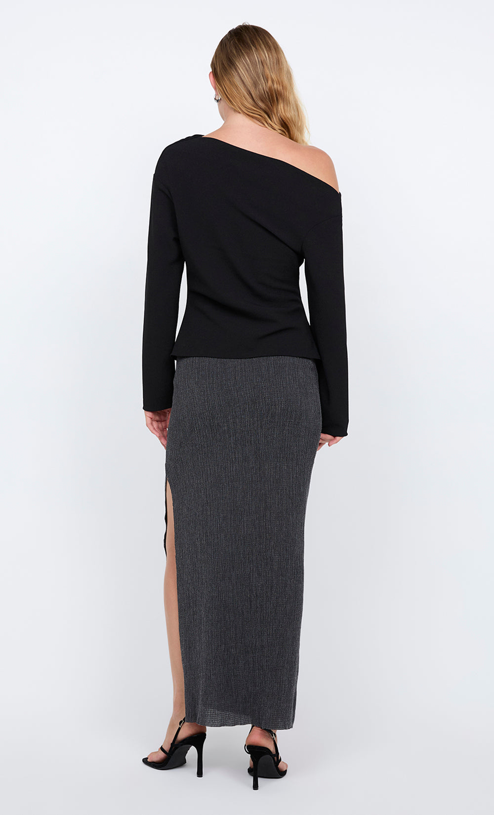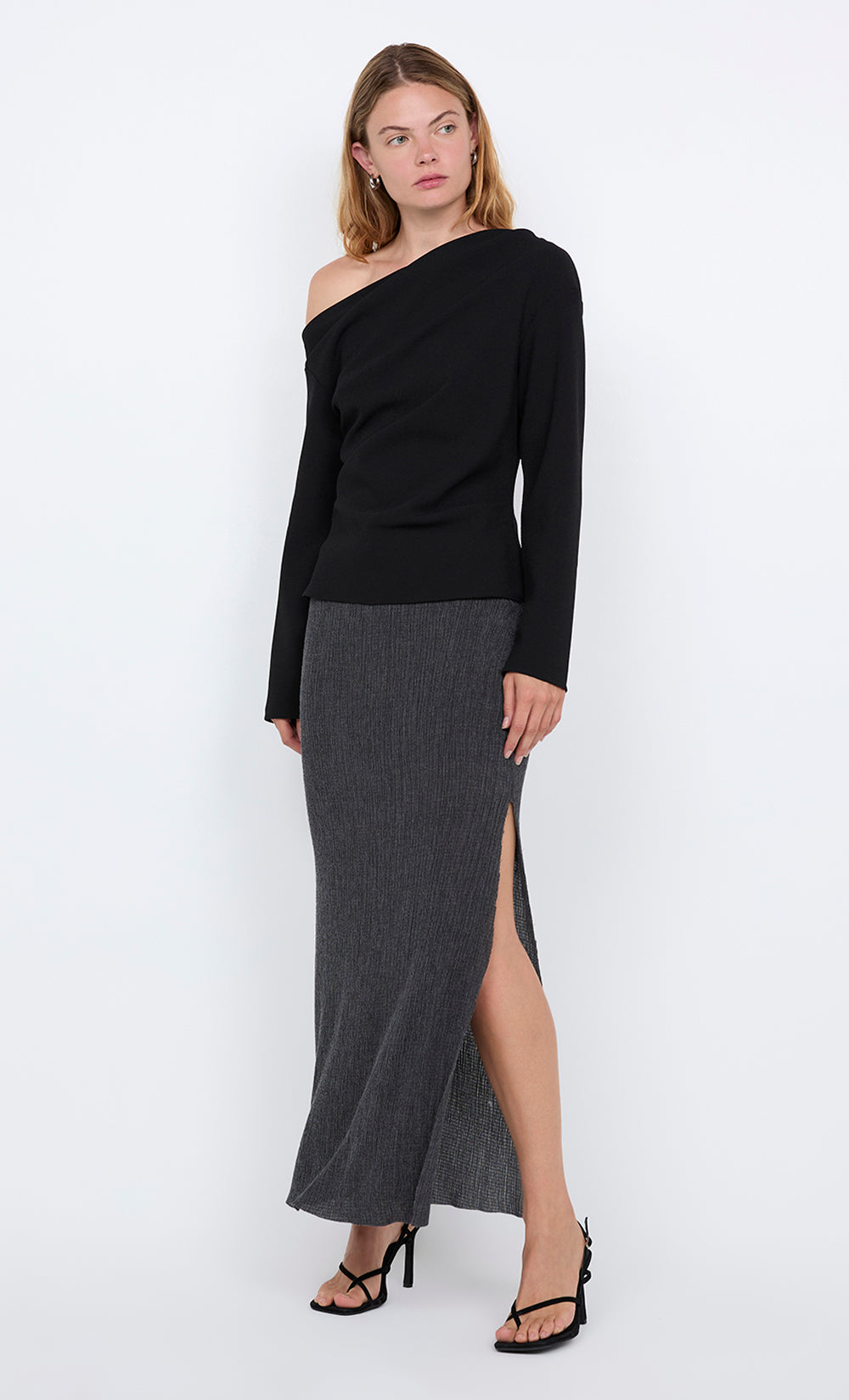 The BEC + BRIDGE Ottie Asym Top in Black is a sophisticated, contemporary piece that makes a statement. Featuring an asymmetrical neckline and long sleeves, this top is shaped with tucks through the waist for a sculpted silhouette. The hem finishes at the low waist for a contemporary look, and the narrow turned-back hems add a refined touch. Perfect for pairing with Bec + Bridge Elena Maxi Skirt or high waist pant for an elevated look.