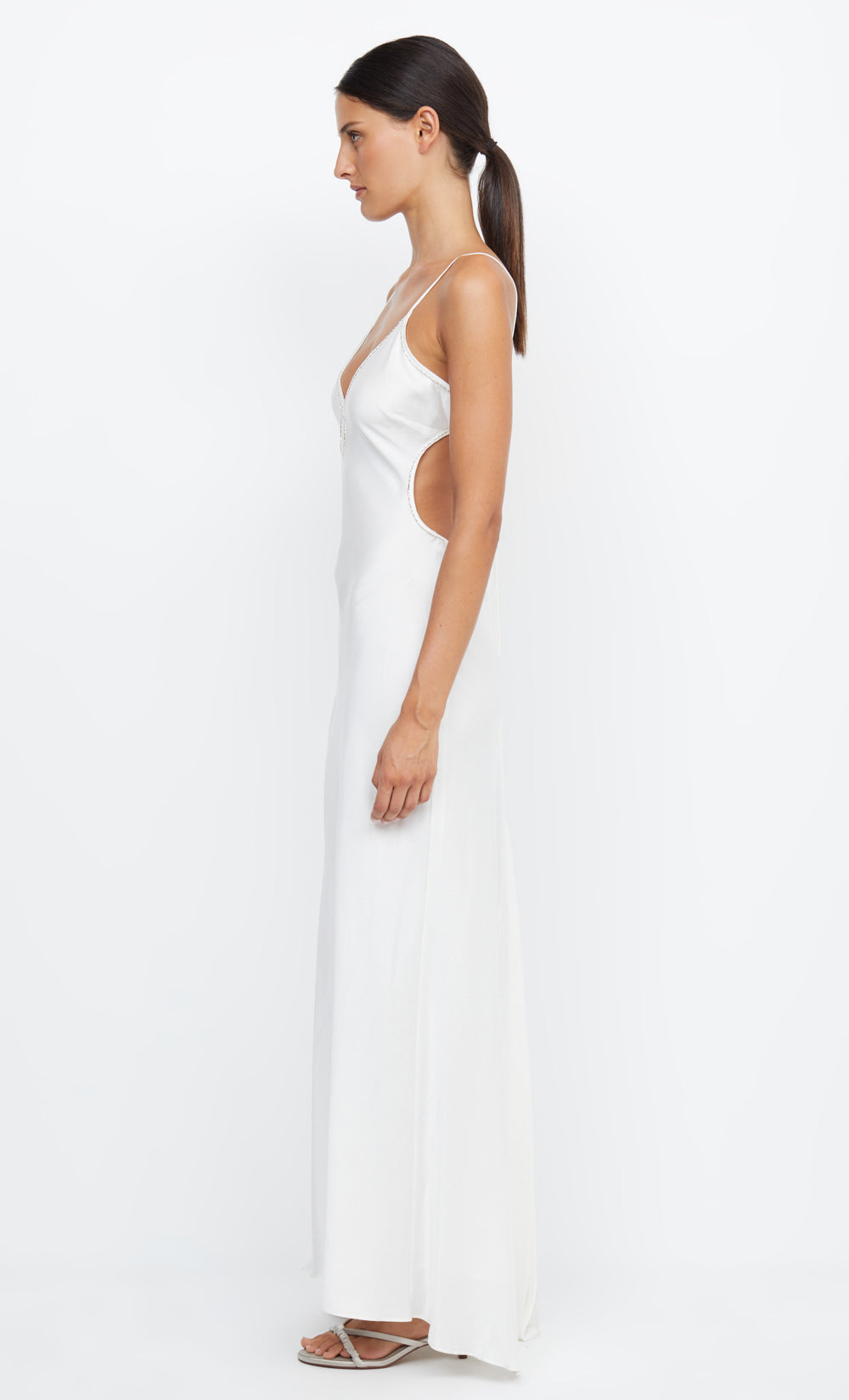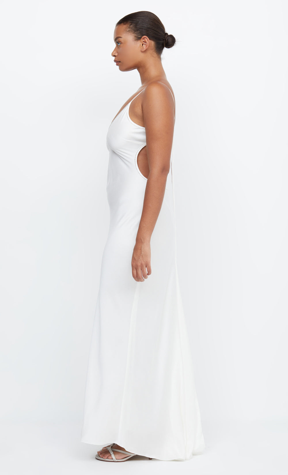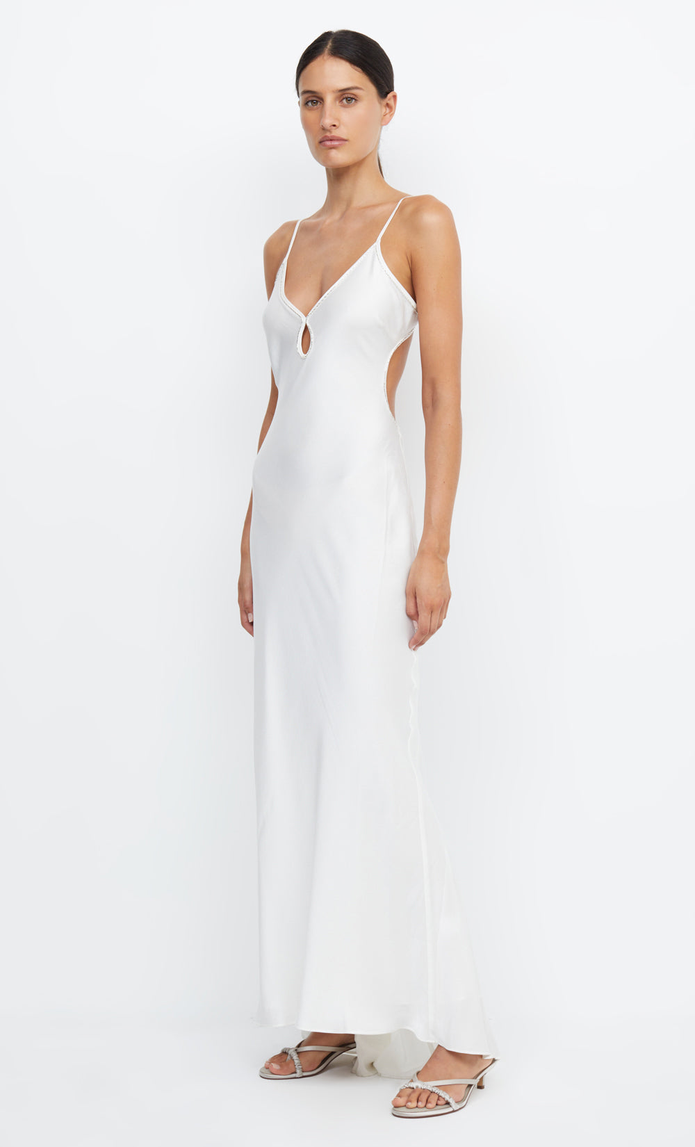 The BEC + BRIDGE Paradise Beaded Maxi Dress is cut on the bias from a lustrous silk fabric. The full length, v-neck dress features a statement keyhole cut-out, delicate glass beaded edge finish and thin straps that tie at a flattering open back.