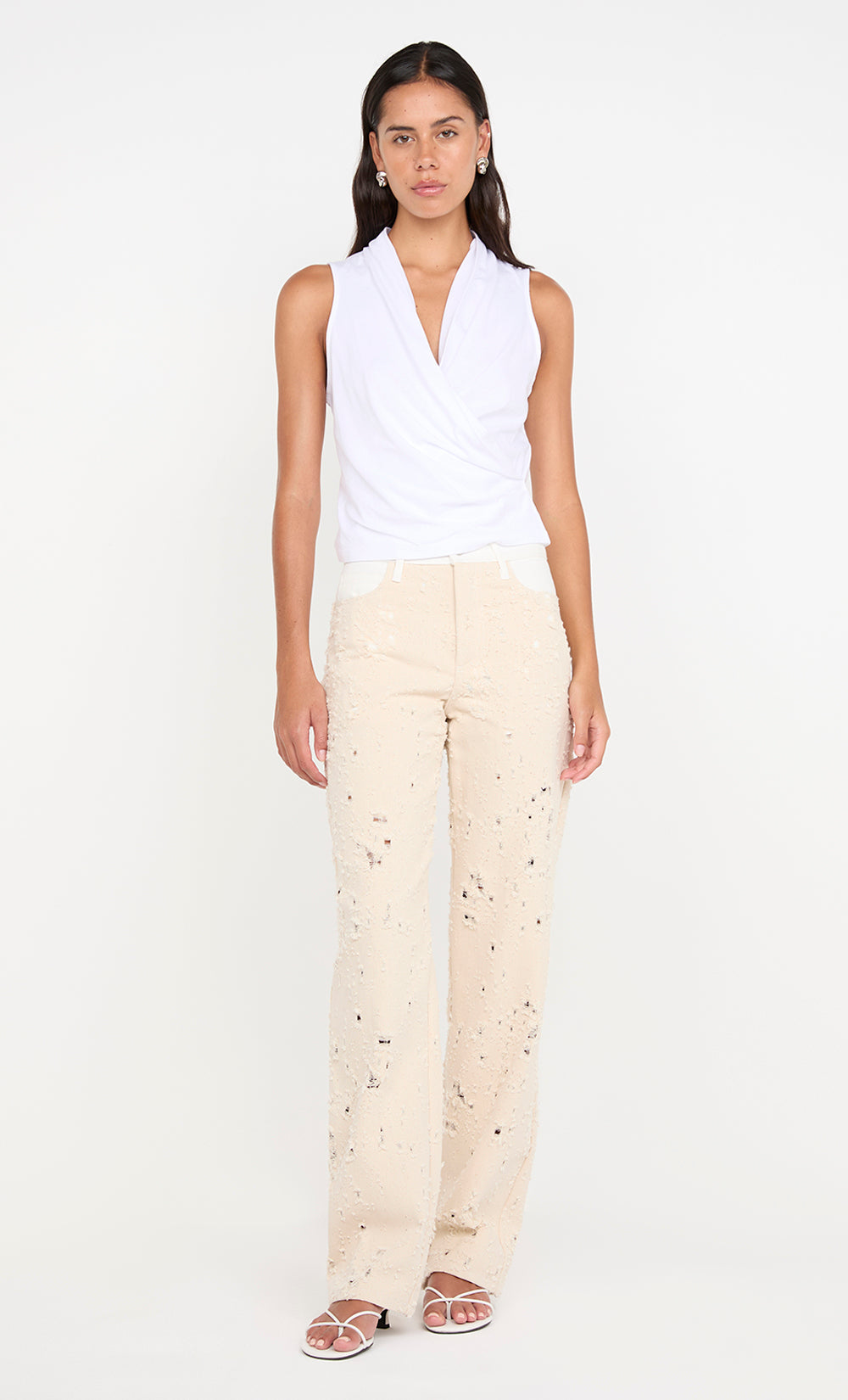 The BEC + BRIDGE Quinn Pant in Natural is a stylish mid to high-waisted jean crafted from distressed denim and panelled with white drill. Featuring a waistband with belt loops, a fly front zipper, and a branded B+B button, it combines comfort with a modern edge. The pant includes front and back patch pockets, with exposed cutout sections highlighting the unique nature of the fabric. Designed with a straight-leg fit, it’s lined to a mini short length and finished with a narrow turned-up hem for a fresh, laid-back look. Pair with BEC + BRIDGE Simi Wrap Top for a chic, relaxed look that transitions easily from day to night.
