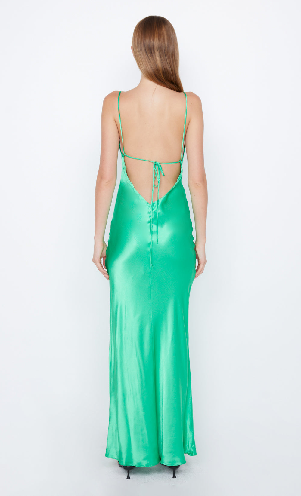 A statement eventwear style, the BEC + BRIDGE Ren Split Maxi Dress is cut on the bias from a lustrous speciality fabric. The dress features a thigh-high split, binding at bust, and fabric rouleau straps that feed through loops and finish at a low-cut, cross-back. This garment is certified Australian Made.