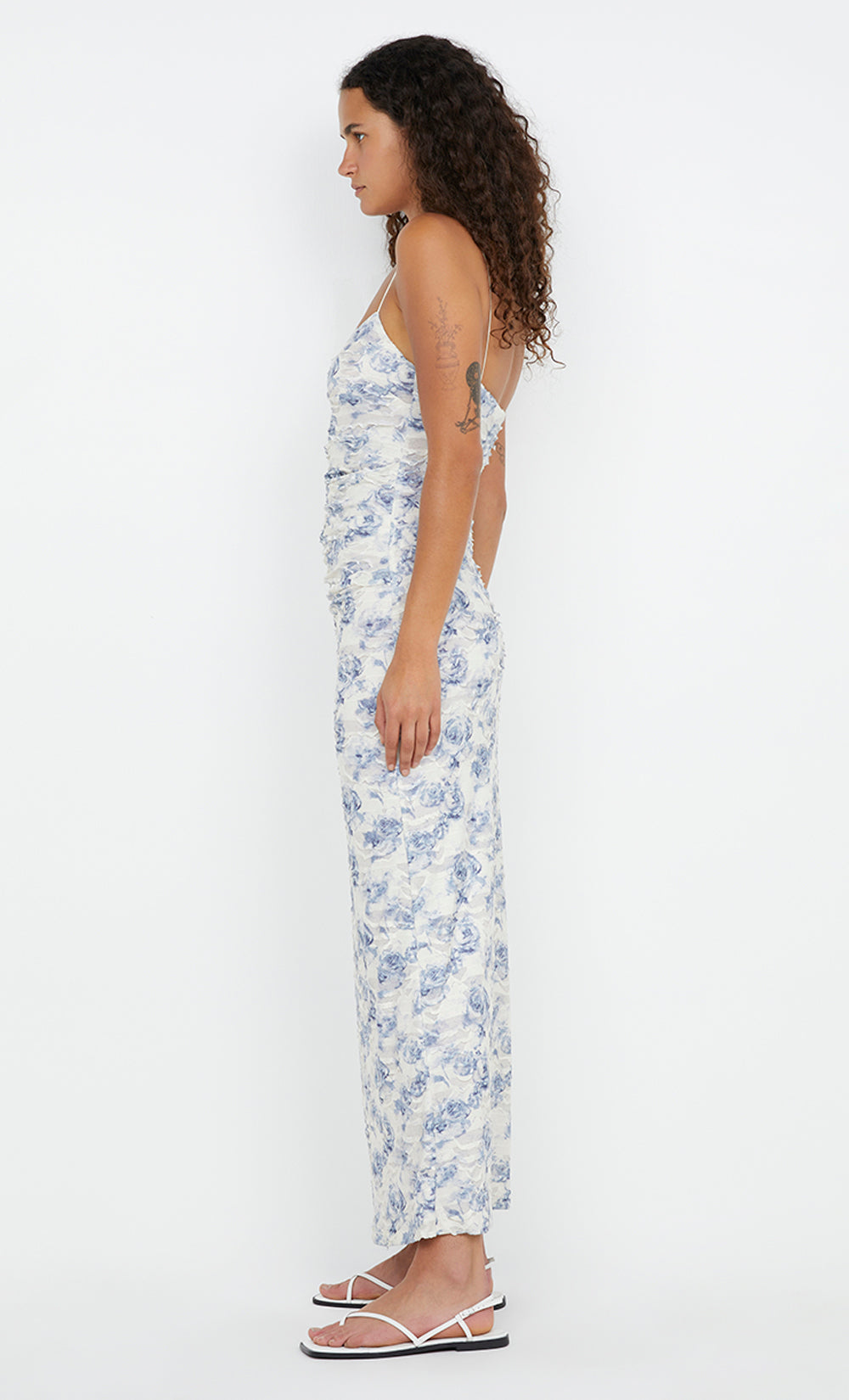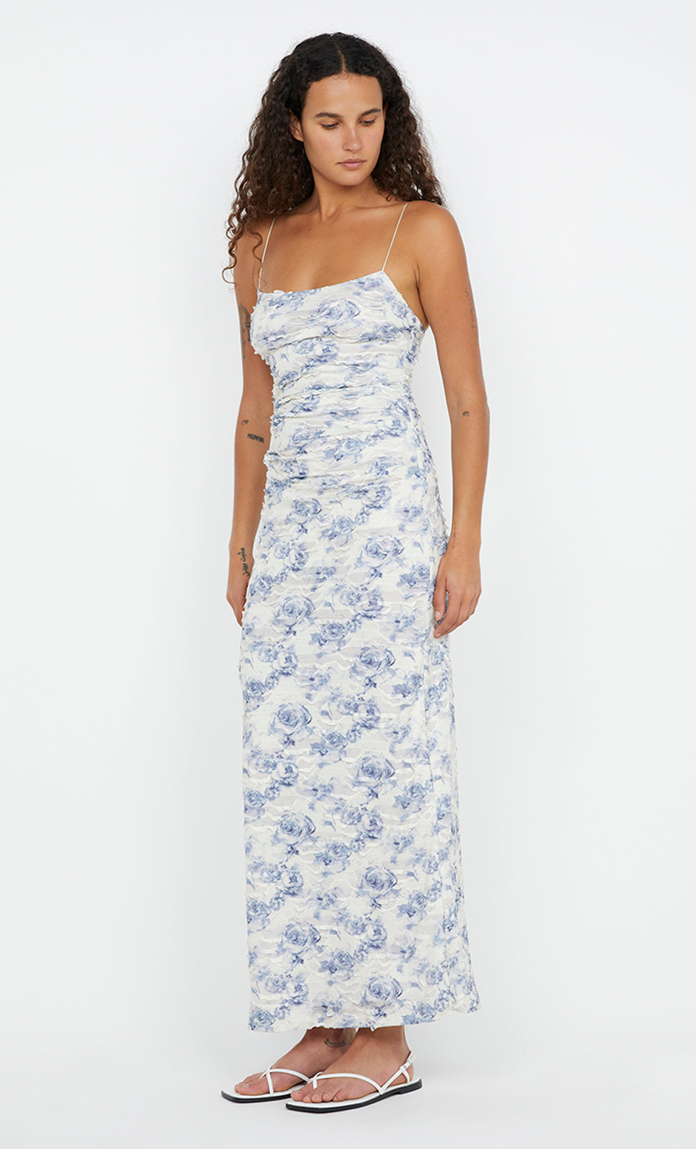The BEC + BRIDGE Riva Maxi Dress in Porcelain Floral is a sleek, fitted maxi dress crafted from a delicate, floral stretch fabric. It features a straight neckline with narrow cord straps and tuck detailing at the waist for a flattering shape. Lined to a mini length for added coverage, this pull-on dress is designed to be fitted through the bodice, flowing into a straight hem for an elegant silhouette. Perfect for garden parties, evening dinners, cocktail parties and any day events.