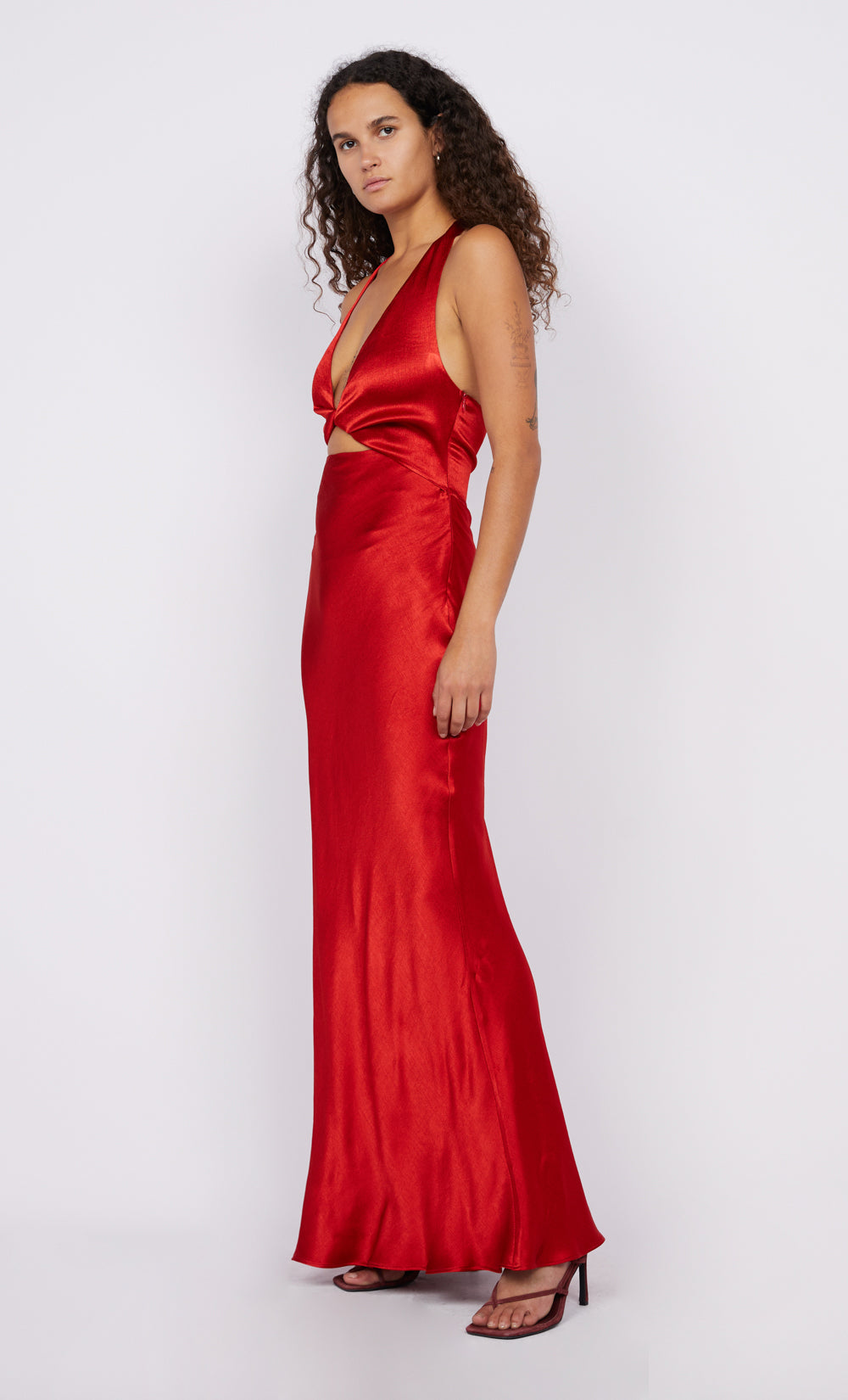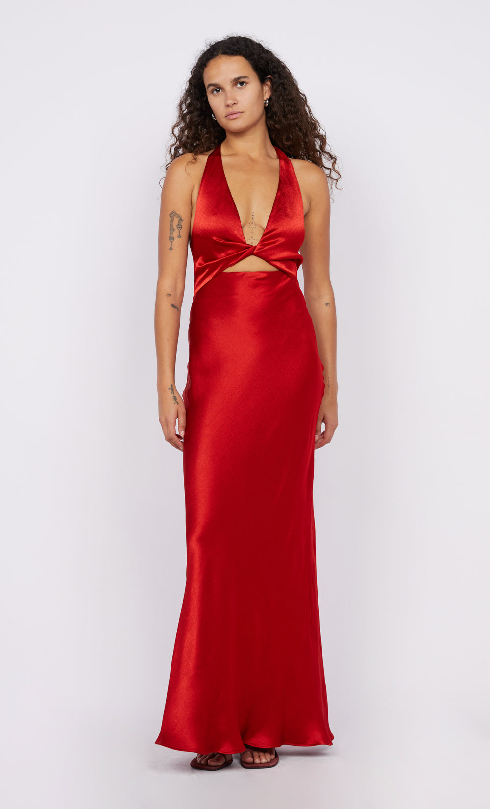 The BEC + BRIDGE Sabia Twist Dress in Rouge is an elegant halter maxi dress, perfect for any formal occasion. Featuring a deep V neckline with a twist detail at the bust and a bias-cut skirt.