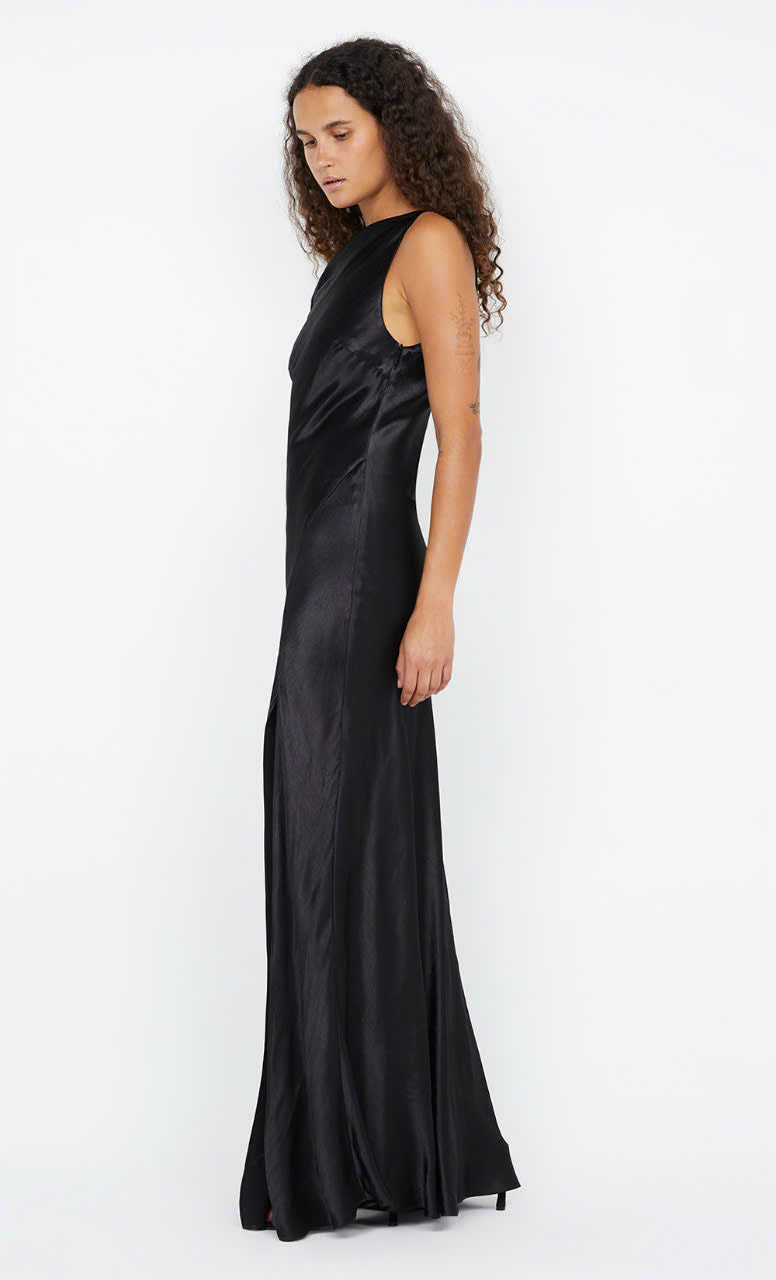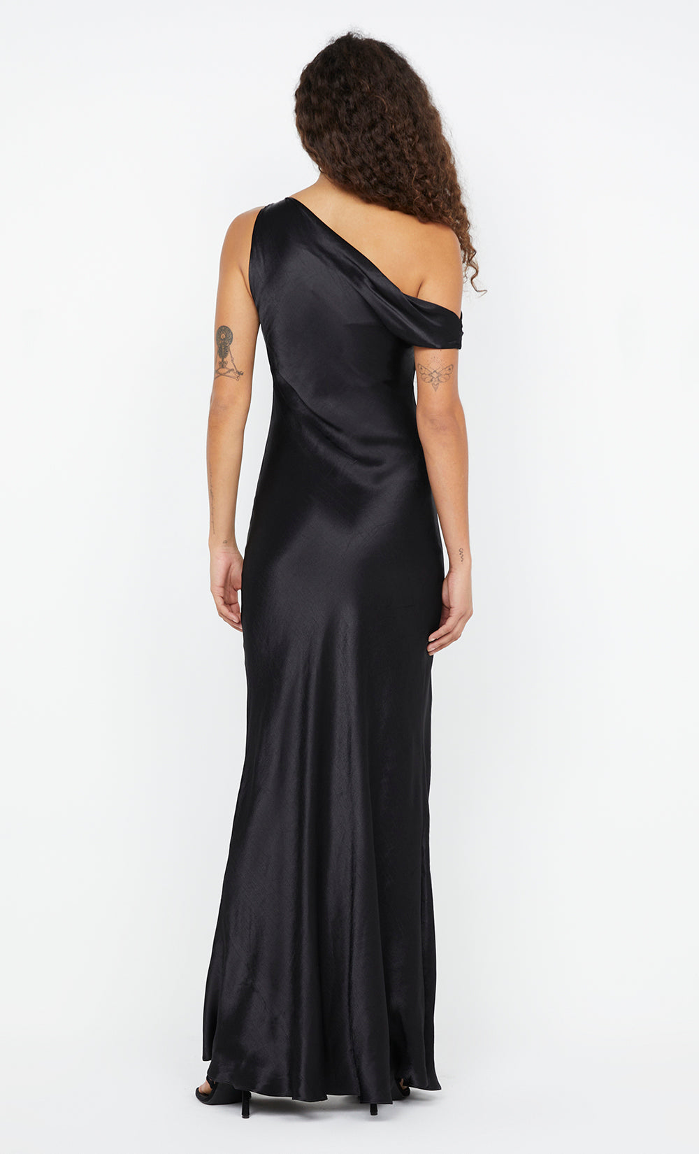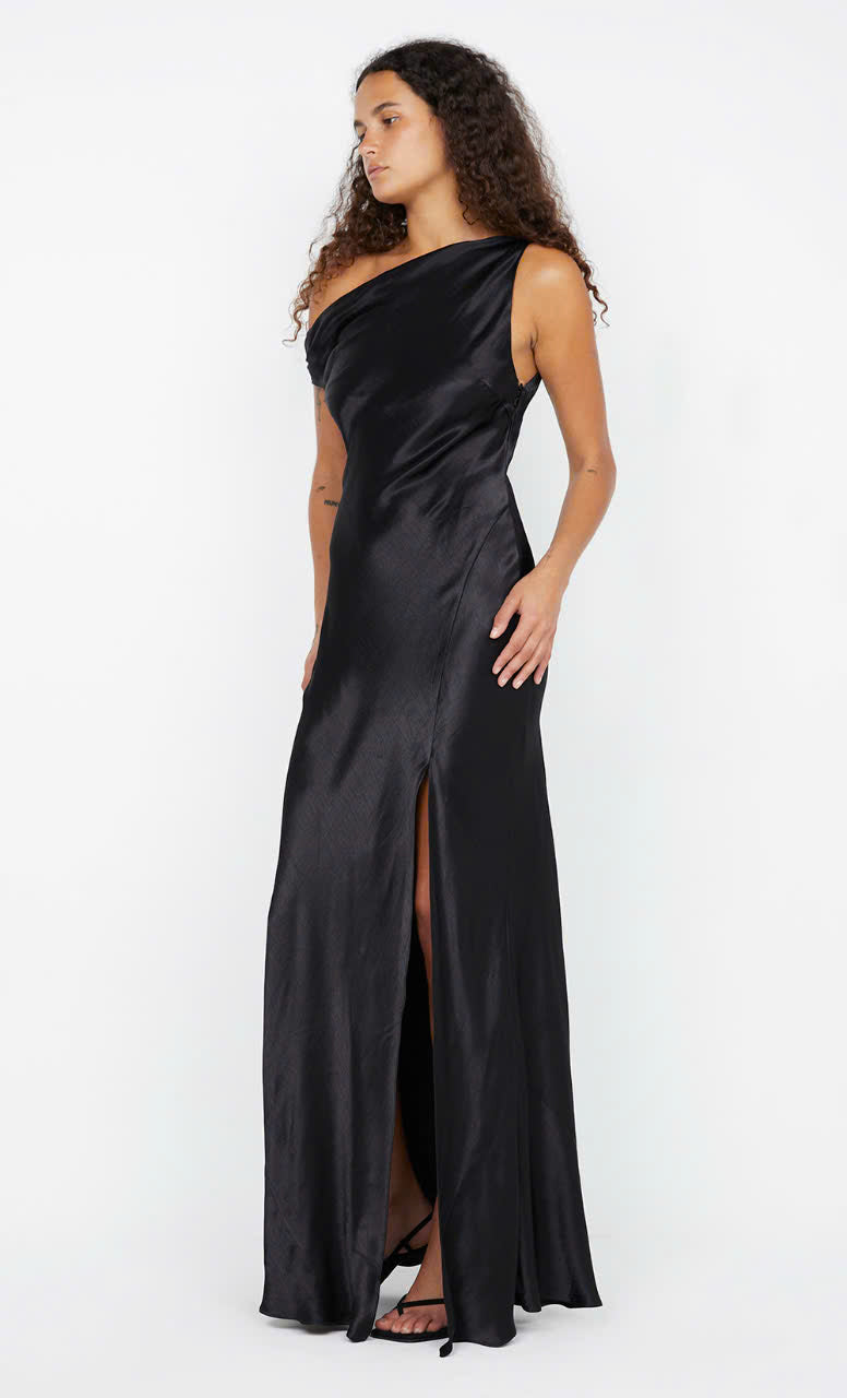 The BEC + BRIDGE Sol Asym Dress in Black is a sophisticated maxi dress with an asymmetrical neckline and bias cut that flatters the figure. Featuring bust darts and a mid-thigh split, it offers a sleek, modern elegance. Finished with a narrow rolled hem and pull-on styling, this dress is perfect as a bridesmaid dress, for special events, or formal occasions. Pair it with the BEC + BRIDGE Kate Heel for a polished, elevated look.