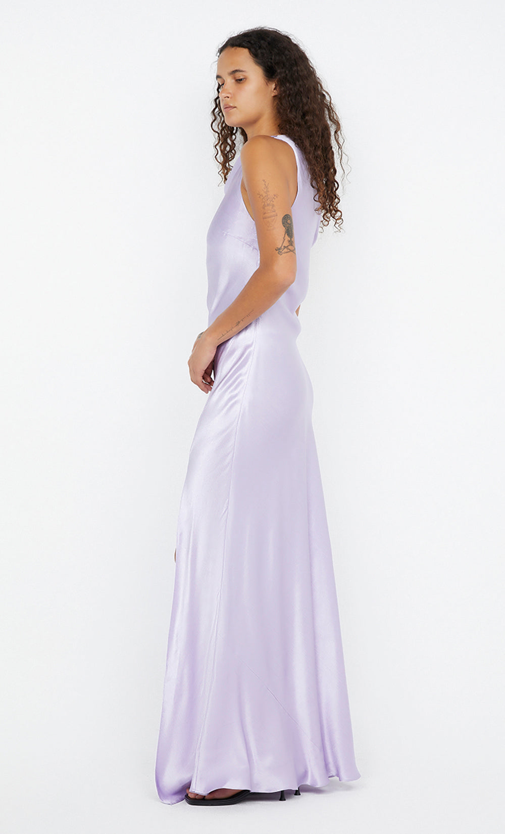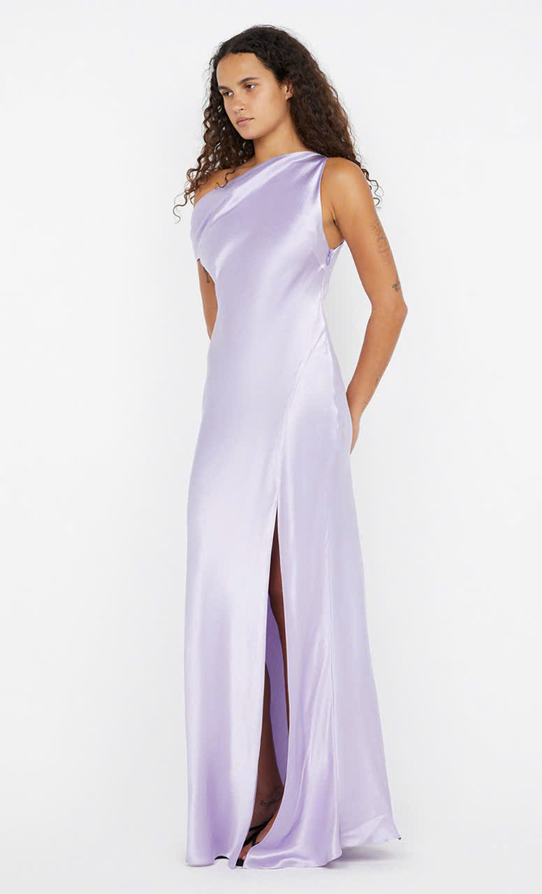 The BEC + BRIDGE Sol Asym Dress in Lilac is a sophisticated maxi dress with an asymmetrical neckline and bias cut that flatters the figure. Featuring bust darts and a mid-thigh split, it offers a sleek, modern elegance. Finished with a narrow rolled hem and pull-on styling, this dress is perfect for special events, or formal occasions. Pair it with the BEC + BRIDGE Kate Heel for a polished, elevated look.