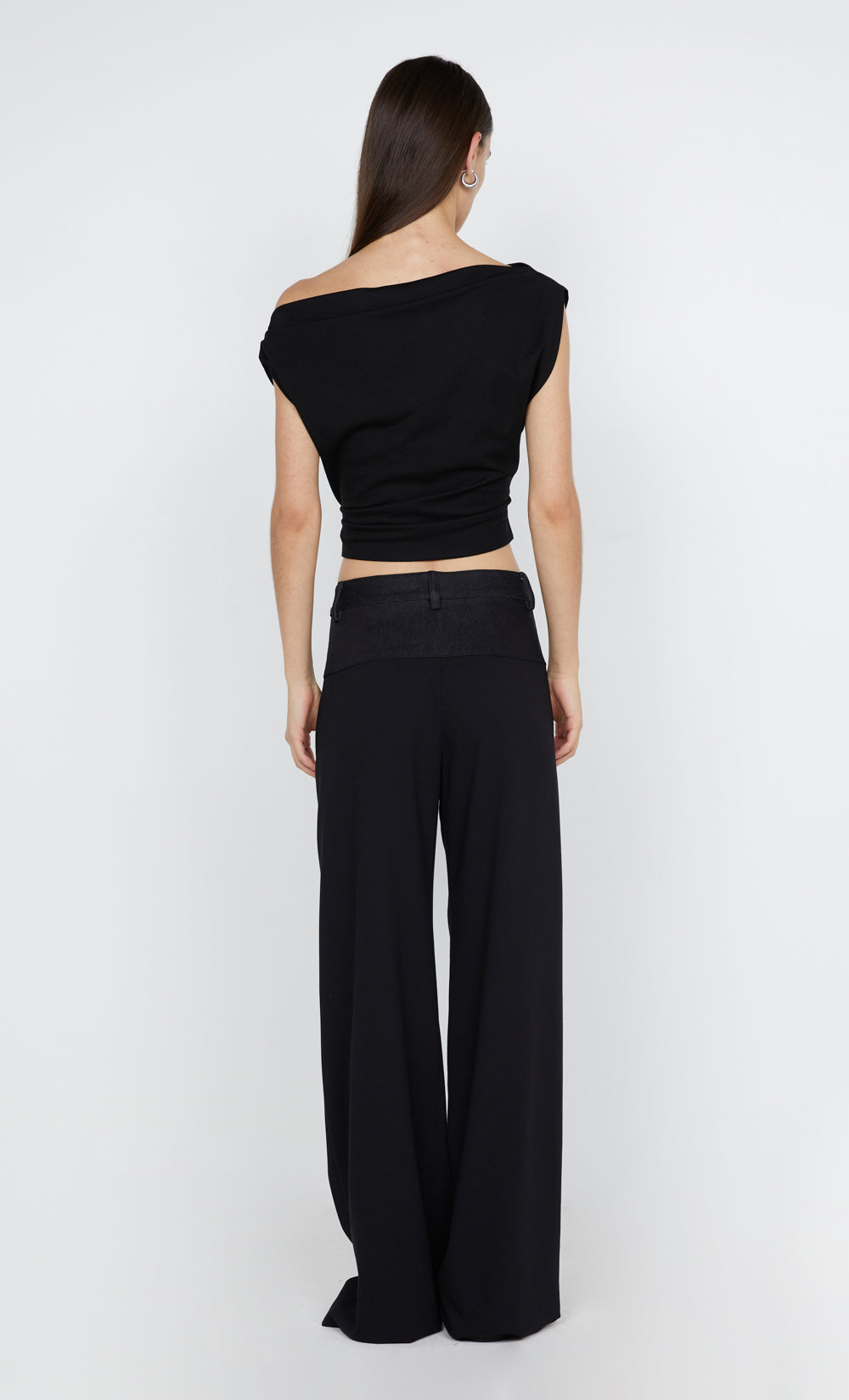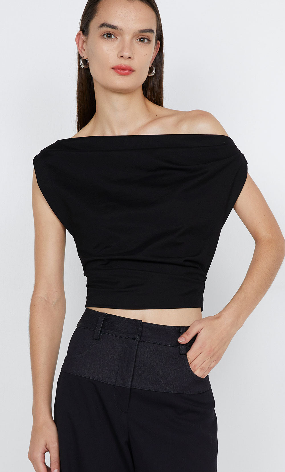 The BEC + BRIDGE Soraya Boat Neck Top in Black is a versatile staple featuring tucks at the shoulders and waistline. Designed for multiple styling options, this top can be worn asymmetrically or as is.