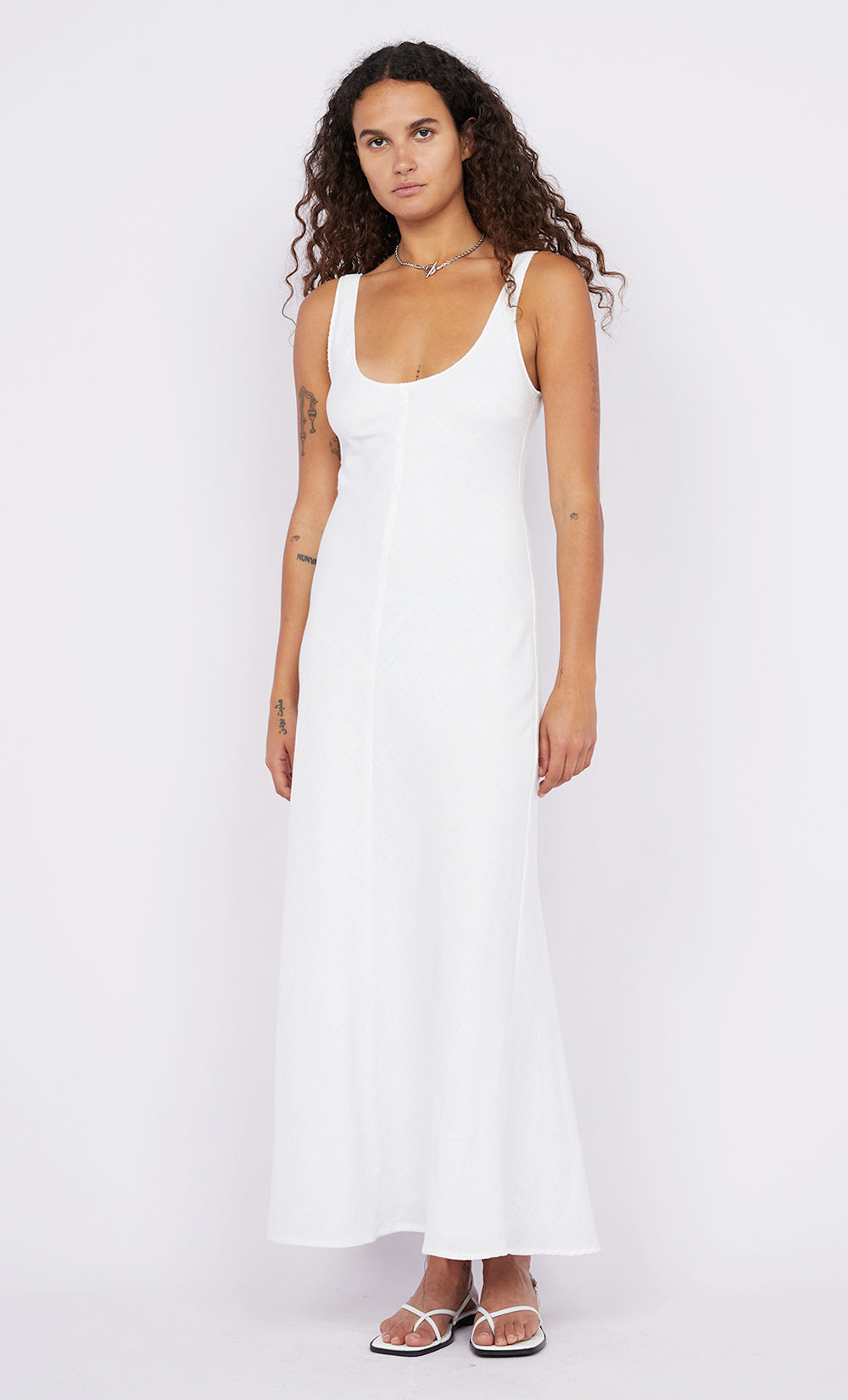 The BEC + BRIDGE Steffi Scoop Neck Dress in White is crafted from breezy cotton and cut on the bias. This maxi dress features a scoop neckline, a centre front seam, and a scoop V-shaped back detail. Pair it with BEC + BRIDGE Kate Sandal for daytime events in warmer seasons.