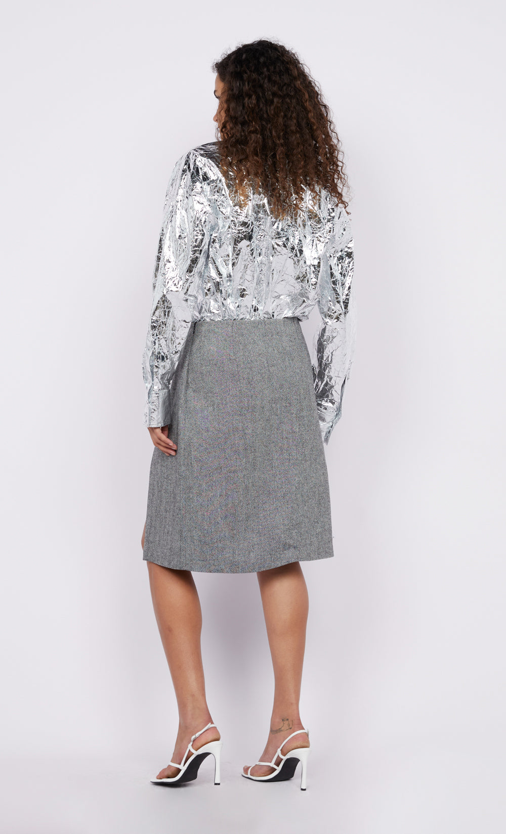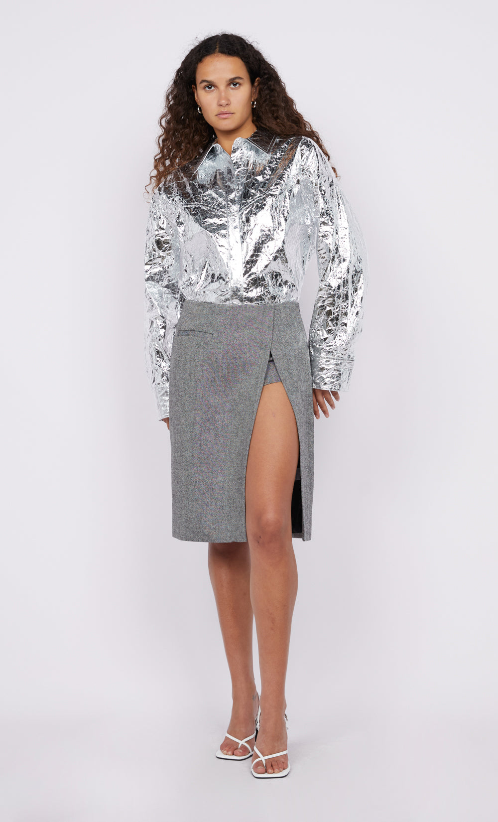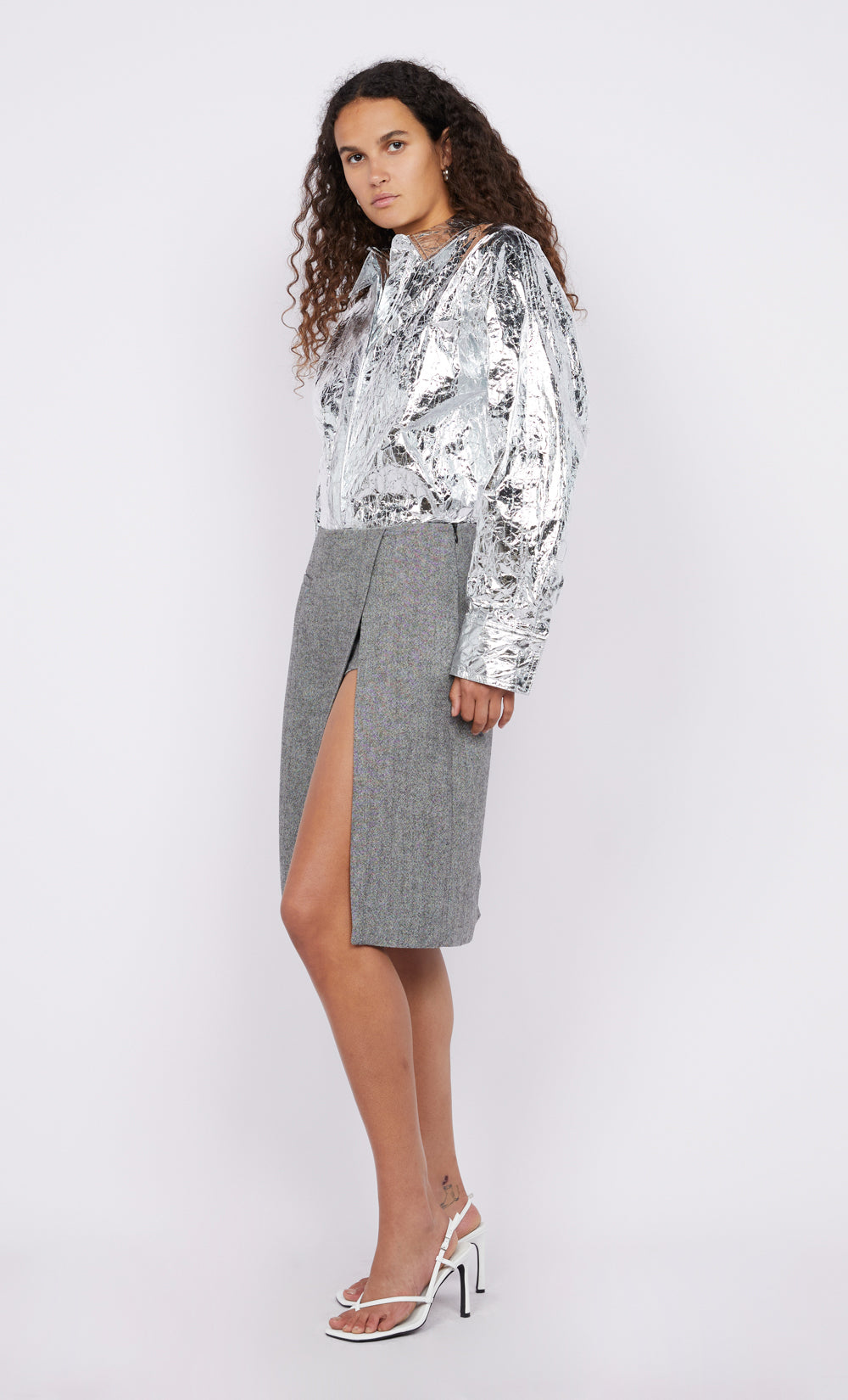 The BEC + BRIDGE Xanthia Yoke Shirt in Silver is a statement piece with a relaxed, boxy silhouette crafted from crushed silver fabric. It features a classic western-style front yoke, a sharp collar, and oversized elbow-length sleeves. Wear this unique shirt to your next party and turn heads.
