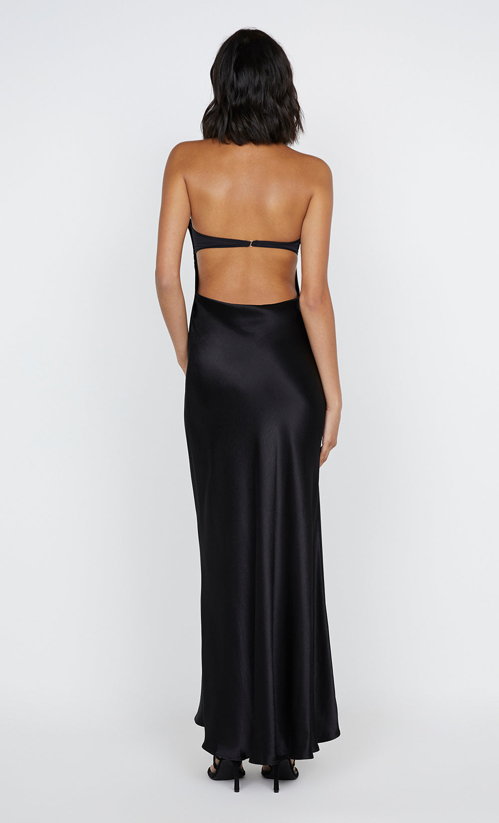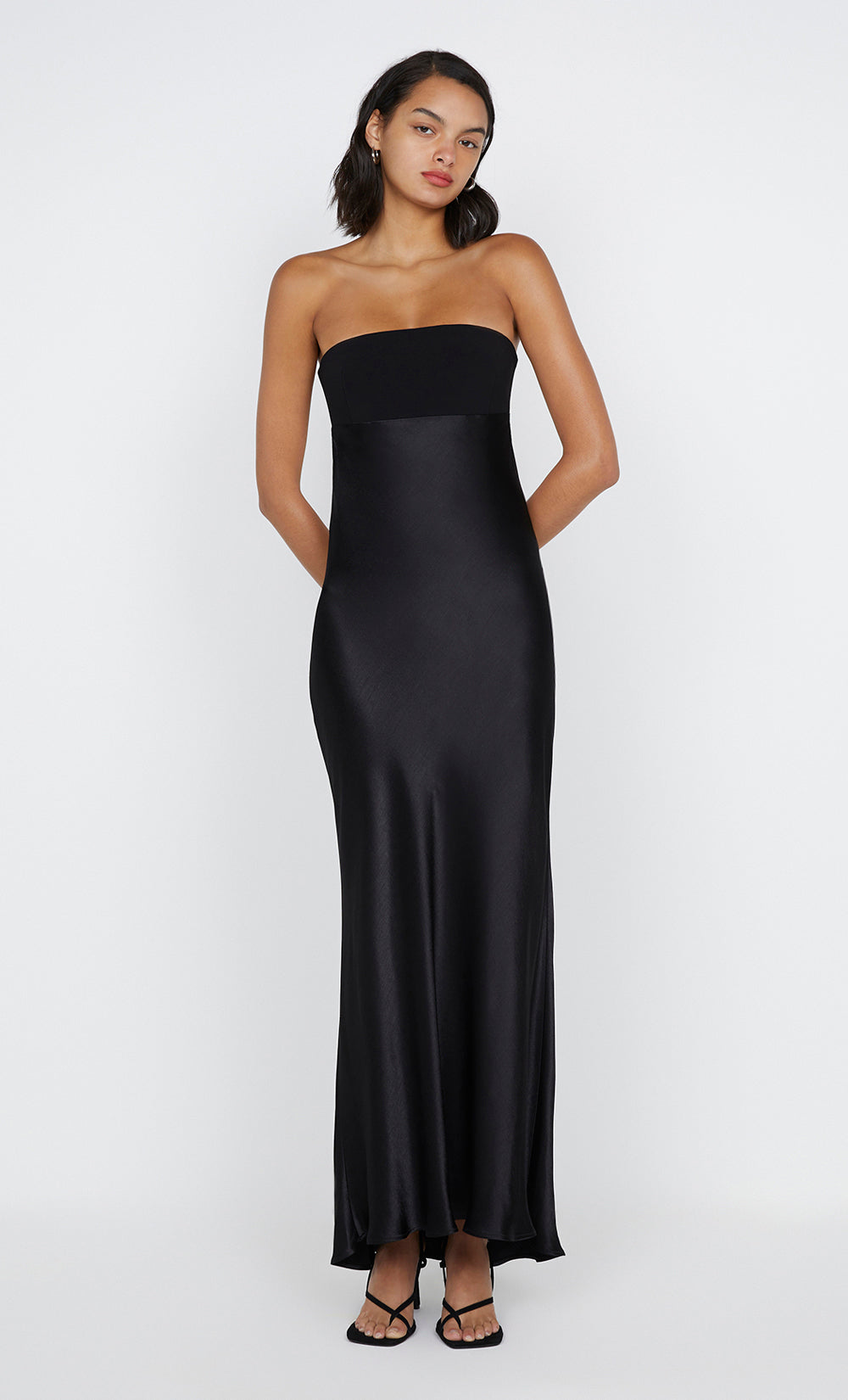 The BEC + BRIDGE Zari Strapless Dress in Black is a timeless style, perfect for your next formal event. Cut in a classic strapless silhouette, this maxi dress features a contrast bonded crepe bust, with an open back detail, before falling into a bias cut skirt section. Pair yours with the Kate Heel.