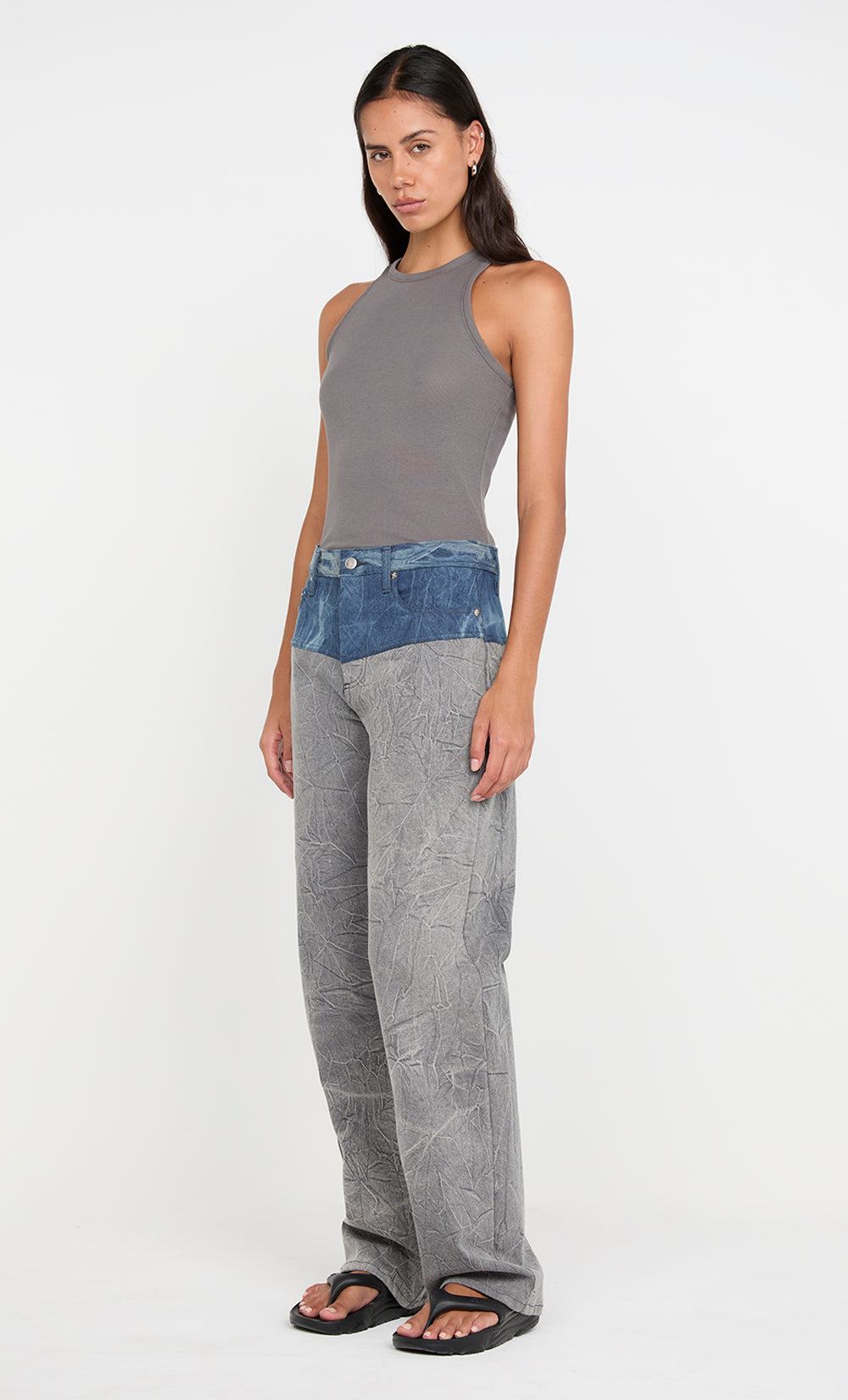 - BEC + BRIDGE Zavier Contrast Jean in Stonewash + Distressed Indigo